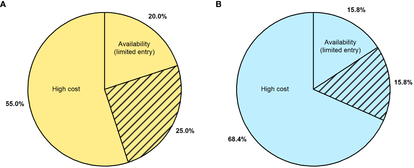 Themes from open-ended responses from fishermen who chose to elaborate on the ability to access or obtain permits as a constraint to adaptive capacity. (A) indicates the percent of responses from market squid fishermen who chose to elaborate (n=20) and (B) indicates the percent of responses from spiny lobster fishermen who chose to elaborate (n=19). Each theme is labeled in the pie chart and hashing indicates overlap between two adjacent themes.