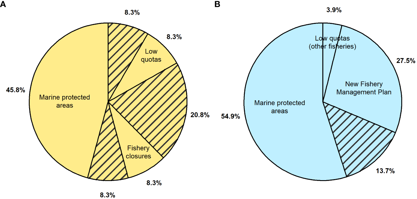 Themes from open-ended responses from fishermen who chose to elaborate on broader concerns with fishery governance and its effects on adaptive capacity. (A) indicates the percent of responses from market squid fishermen who chose to elaborate (n=23) and (B) indicates the percent of responses from spiny lobster fishermen who chose to elaborate (n=37). Each theme is labeled in the pie chart and hashing indicates overlap between two adjacent themes.