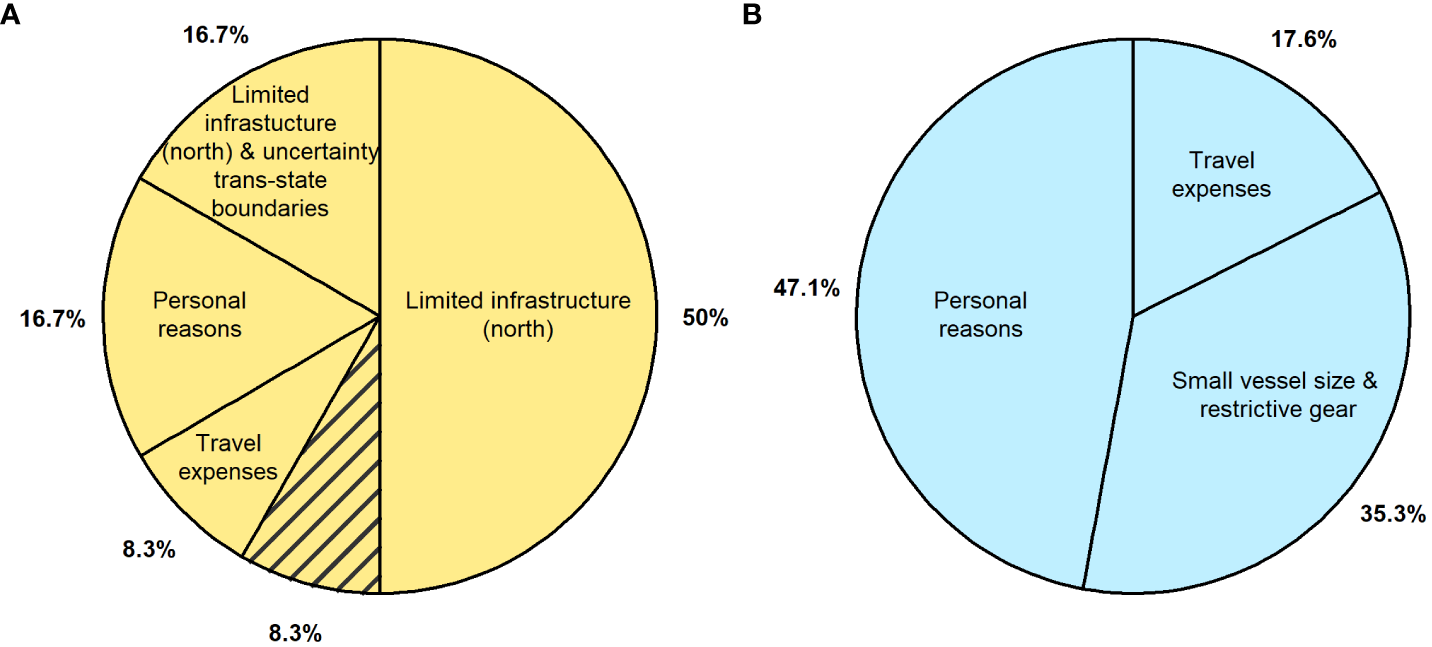 Themes from open-ended responses from fishermen who chose to elaborate on travel/mobility-related constraints to adaptive capacity. (A) indicates the percent of responses from market squid fishermen who chose to elaborate (n=11) and (B) indicates the percent of responses from spiny lobster fishermen who chose to elaborate (n=17). Each theme is labeled in the pie chart and hashing indicates overlap between two adjacent themes. Note that half of fishermen cited limited infrastructure in northern regions alone and an additional 16.7% cited that along with uncertainty in trans-state fishery boundaries (e.g., Oregon, Washington, Alaska).