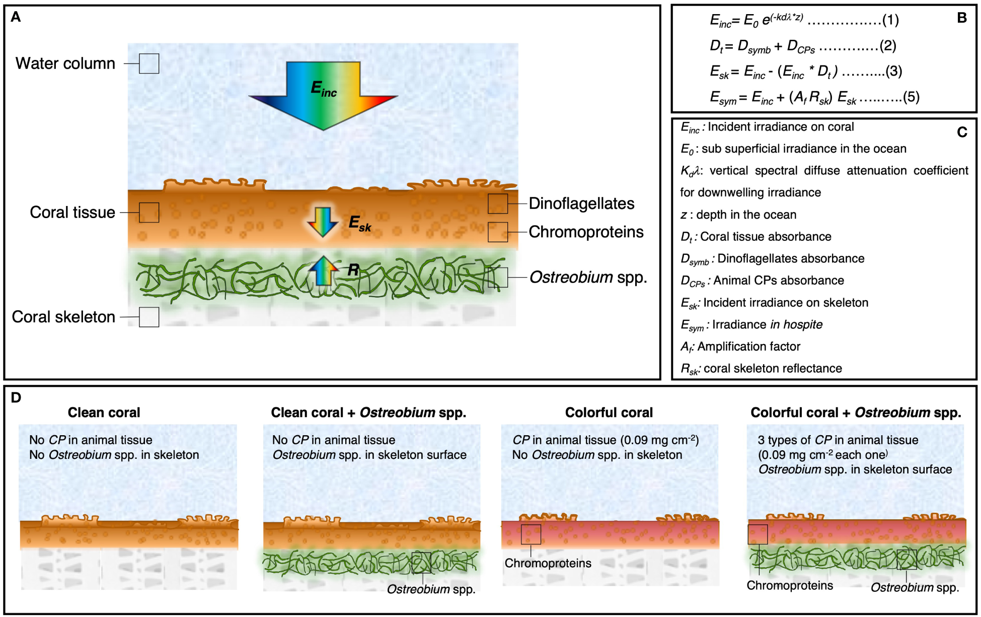 Figure 1 Description of the numerical model for light absorption in corals. (A) Schematic representation of the coral model. Arrows indicate the parameters used to determine the light environment in hospite for the symbionts. (B) Equations used in the numerical model for the calculation of (1) the incident irradiance on the coral, (2) the coral tissue absorbance, (3) the incident irradiance in the skeleton, and (5) and the light environment in hospite for the symbionts. (C) Description of the variables used in the model. (D) Different scenarios of light absorption in corals: a clean coral with a white skeleton (no chromoproteins, no Ostreobium spp.), clean coral with an Ostreobium spp. bloom near the skeletal surface, a colorful coral with one of the three chromoproteins upregulated in the tissue: asulCP562, amilCP580, or amilCP604 (0.09 mg cm-2), and a colorful coral with an Ostreobium spp. bloom near the skeletal surface.
