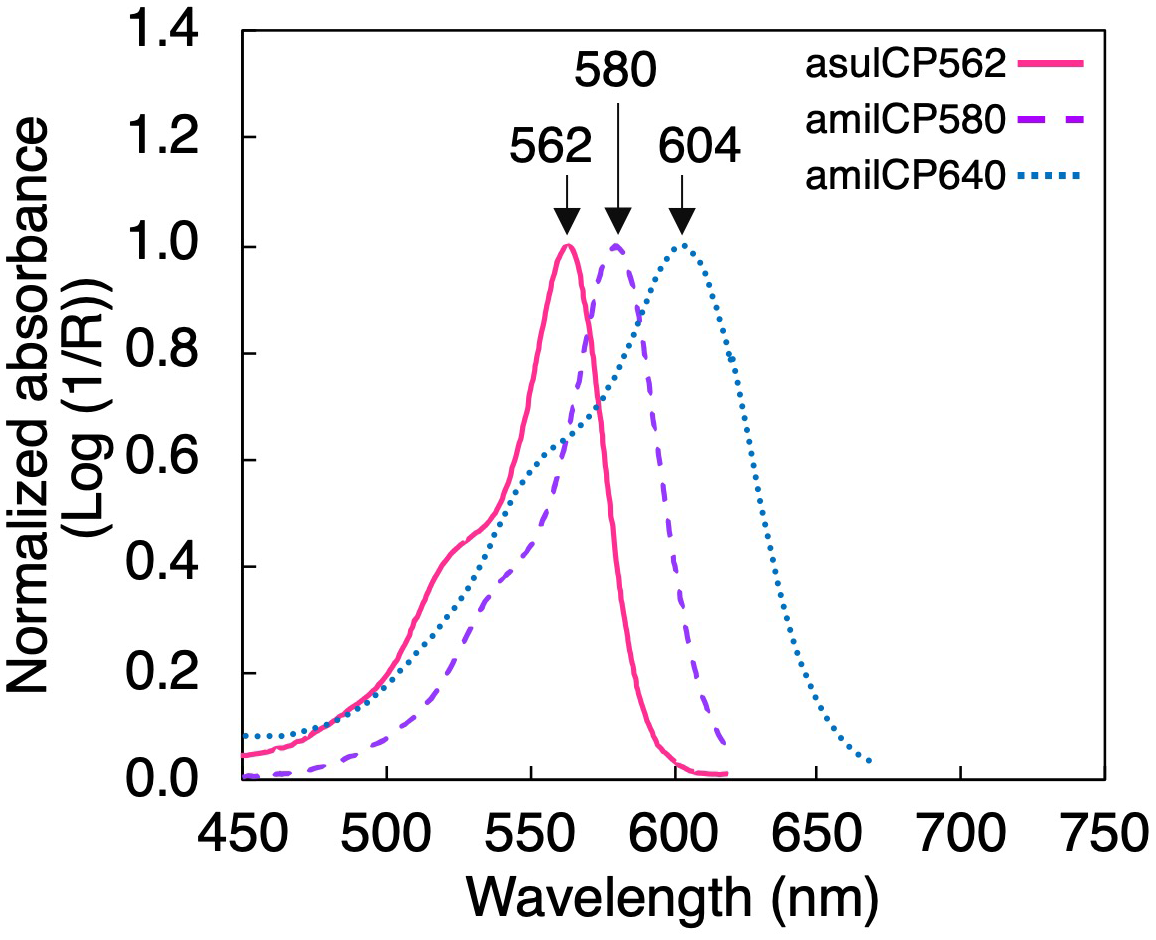 Figure 2 In vitro light absorption spectra for the three coral chromoproteins used in the numerical model: asulCP562 (pink solid line), amilCP580 (purple dashed line), and amilCP604 (blue dotted line) extracted from coral tissue (after Smith et al., 2013).