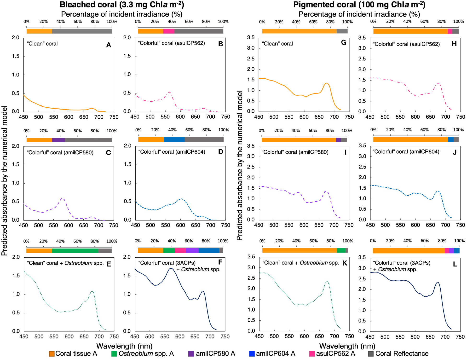 Figure 3 Predicted absorption spectra for a bleached (A-F, 3.3 mg Chla m-2) and a pigmented coral (G-L, 100 mg Chla m-2) under different scenarios: a coral with a white skeleton (yellow solid line, A, G), a coral with the chromoprotein asulCP562 upregulated in its tissue (pink dotted line, B, H), a coral with the chromoprotein amilCP580 upregulated in its tissue (purple dashed line, C, I), a coral with the chromoprotein amilCP604 upregulated in its tissue (clear blue dotted line, D, J), a coral with an Ostreobium bloom in the skeletal surface (green dotted line, E, K), and a coral with the three chromoproteins upregulated in its tissue and an Ostreobium bloom in the skeletal surface (navy blue solid line, F, L). Superior panels indicate the percentage of incident PAR utilized by each pigmented layer: coral tissue (yellow), chromoprotein asulCP562 (pink), chromoprotein amilCP580 (purple), chromoprotein amilCP604 (blue), Ostreobium spp. (green), and coral reflectance (gray).