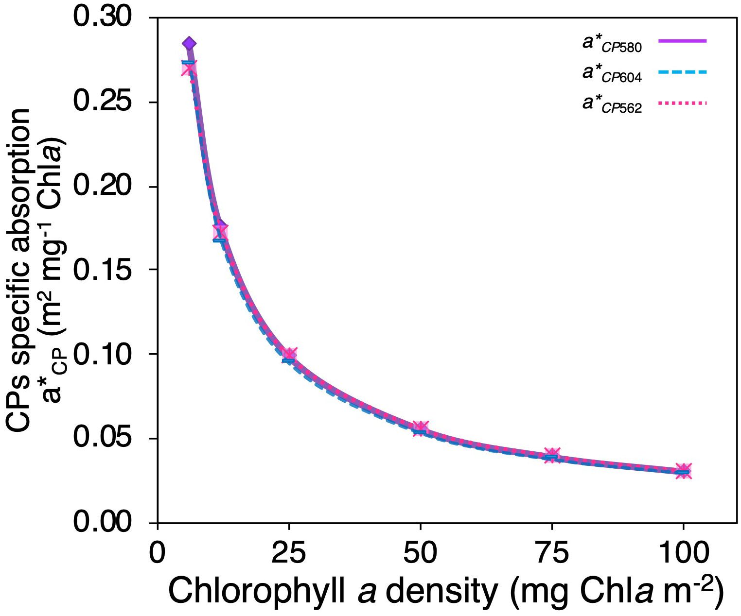 Figure 4 Comparison of changes in animal CP specific absorption coefficient (a*CP) as a function of Chla density of “colorful” corals for the three animal CPs used in the numerical model asulCP562 (pink dotted line), amilCP580 (purple solid line), and amilCP604 (clear blue dashed line).