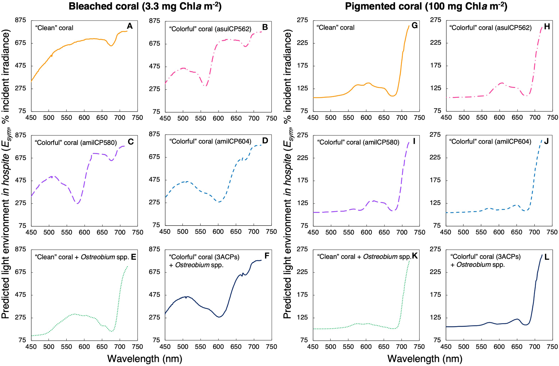 Figure 5 Predicted light environment in hospite for a bleached coral (A-F, 3.3 mg Chla m-2) and a pigmented coral (G-L, 100 mg Chla m-2) under different scenarios: a coral with a white skeleton (yellow solid line, A, G), a coral with the chromoprotein asulCP562 upregulated in its tissue (pink dotted line, B, H), a coral with the chromoprotein amilCP580 upregulated in its tissue (purple dashed line, C, I), a coral with the chromoprotein amilCP604 upregulated in its tissue (clear blue dotted line, D, J), a coral with an Ostreobium bloom in the skeletal surface (green dotted line, E, K), and, a coral with the three chromoproteins upregulated in its tissue and an Ostreobium bloom in the skeletal surface (navy blue solid line, F, L).