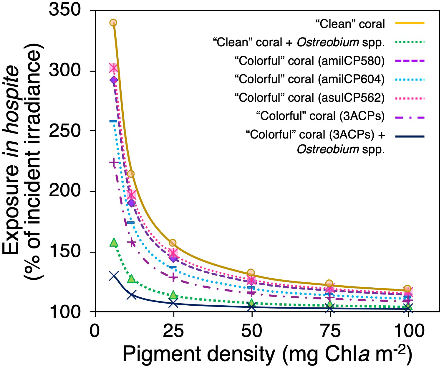 Figure 6 Modification of the light environment in hospite as a function of the pigment content for different coral scenarios, a “clean” coral with a white skeleton (yellow solid line), a coral with an Ostreobium bloom in the skeletal surface (green dotted line), a “colorful” coral with the chromoprotein asulCP562 upregulated in its tissue (pink dotted line), a “colorful” coral with the chromoprotein amilCP580 upregulated in its tissue (purple dashed line), a “colorful” coral with the chromoprotein amilCP604 upregulated in its tissue (clear blue dotted line), a “colorful” coral with the three chromoproteins upregulated in its tissue (purple dotted-dashed line), and a “colorful” coral with the three chromoproteins upregulated in its tissue and with an Ostreobium bloom in the skeletal surface (navy blue solid line).