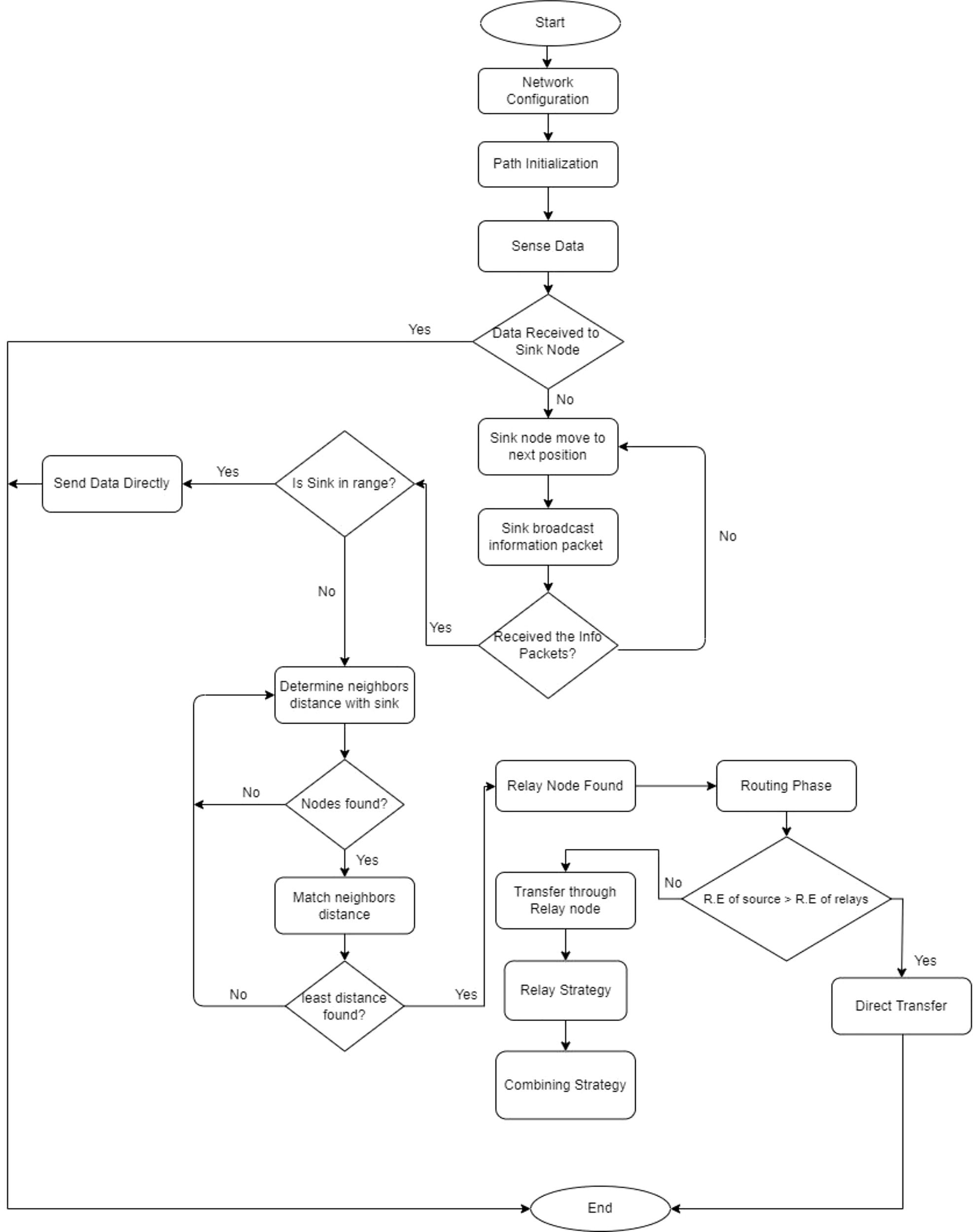Due to the aforementioned limitations, this research article introduces an enhanced version of RACE called Reliability and Adaptive Cooperation for Efficient UWSNs using sink mobility (RACE-SM). The proposed method transfers data to the sink node in two ways. First, when the sensor node detects the sink node, the communication range will transfer the data directly to the sink node instead of the multi-hopping method. Second, data are transmitted through the relay nodes. When the sink node is not in the communication range, the sensor nodes transfer the data to relay nodes and then to the sink node.