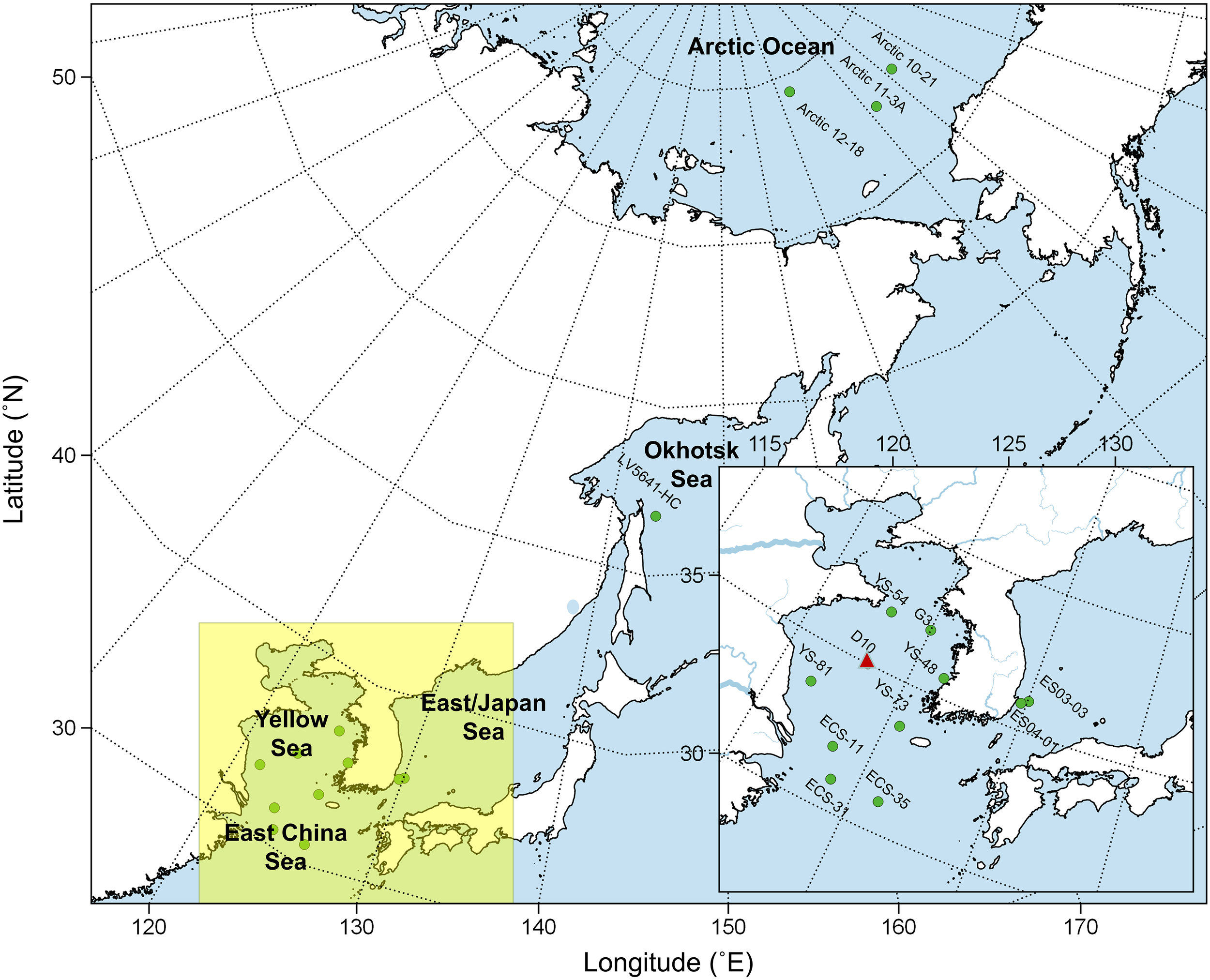 Sampling sites of this study. The triangle symbol indicates a core sample collected in the Yellow Sea.