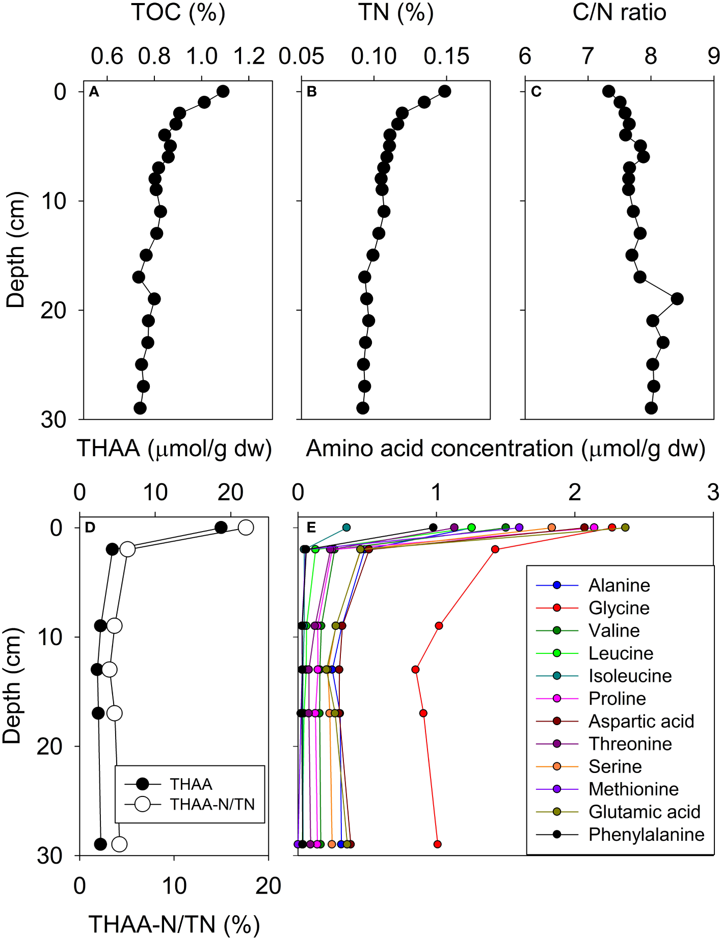 Vertical profile of core D10. TOC (A), TN contents (B), C/N ratio (C), THAA concentration and THAA-N/TN percent (D), and individual AA concentrations (E).