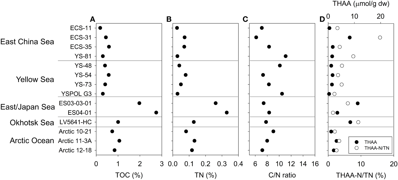 TOC (A), TN (B), C/N ratio (C), THAA concentration and THAA-N/TN percent (D) of surface sediments.