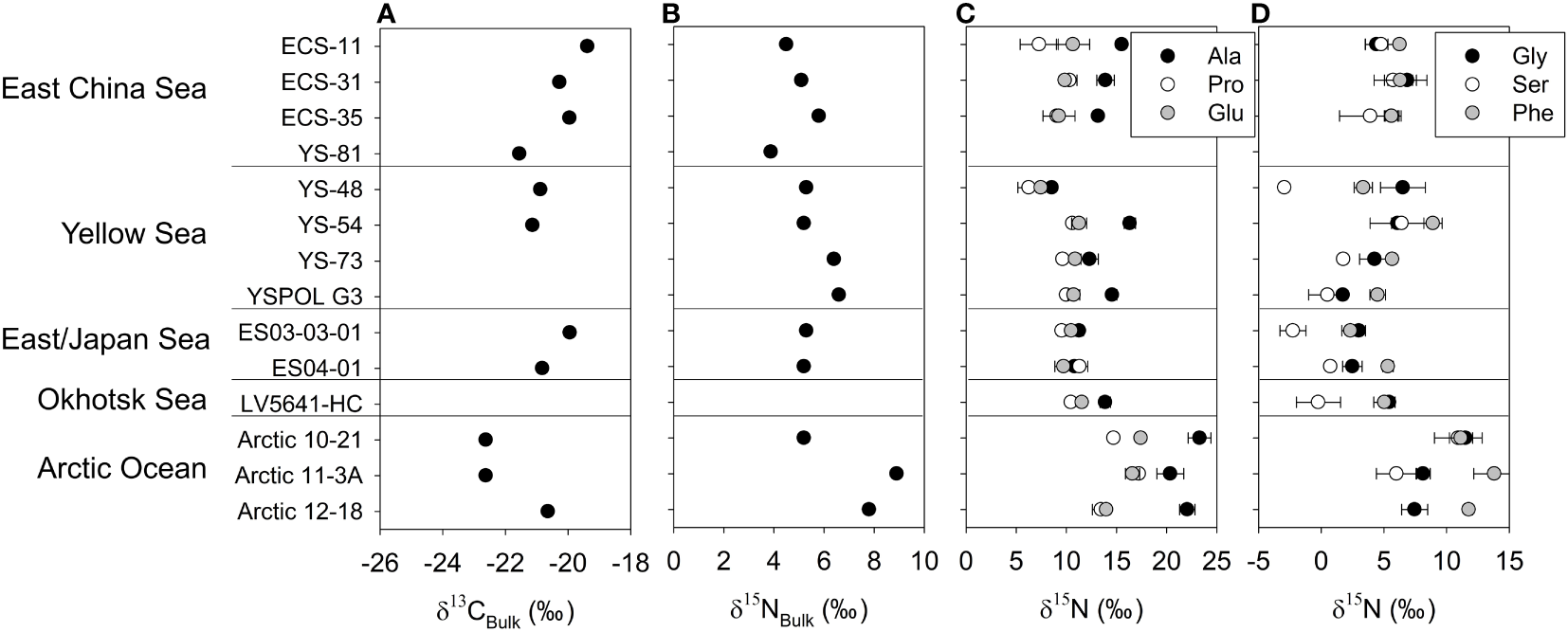 δ13CBulk(A), δ15NBulk(B), trophic (C), source and other AA δ15NAA profiles (D) of core D10. Error bars indicate the standard deviation of the duplicate measurement.