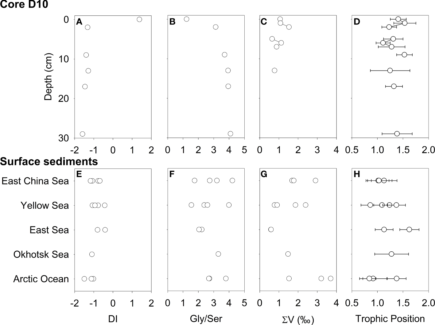 Degradation index (A, E), Gly/Ser ratio (B, F), ∑V (C, G), and trophic position (D, H) of core D10 and surface sediment.
