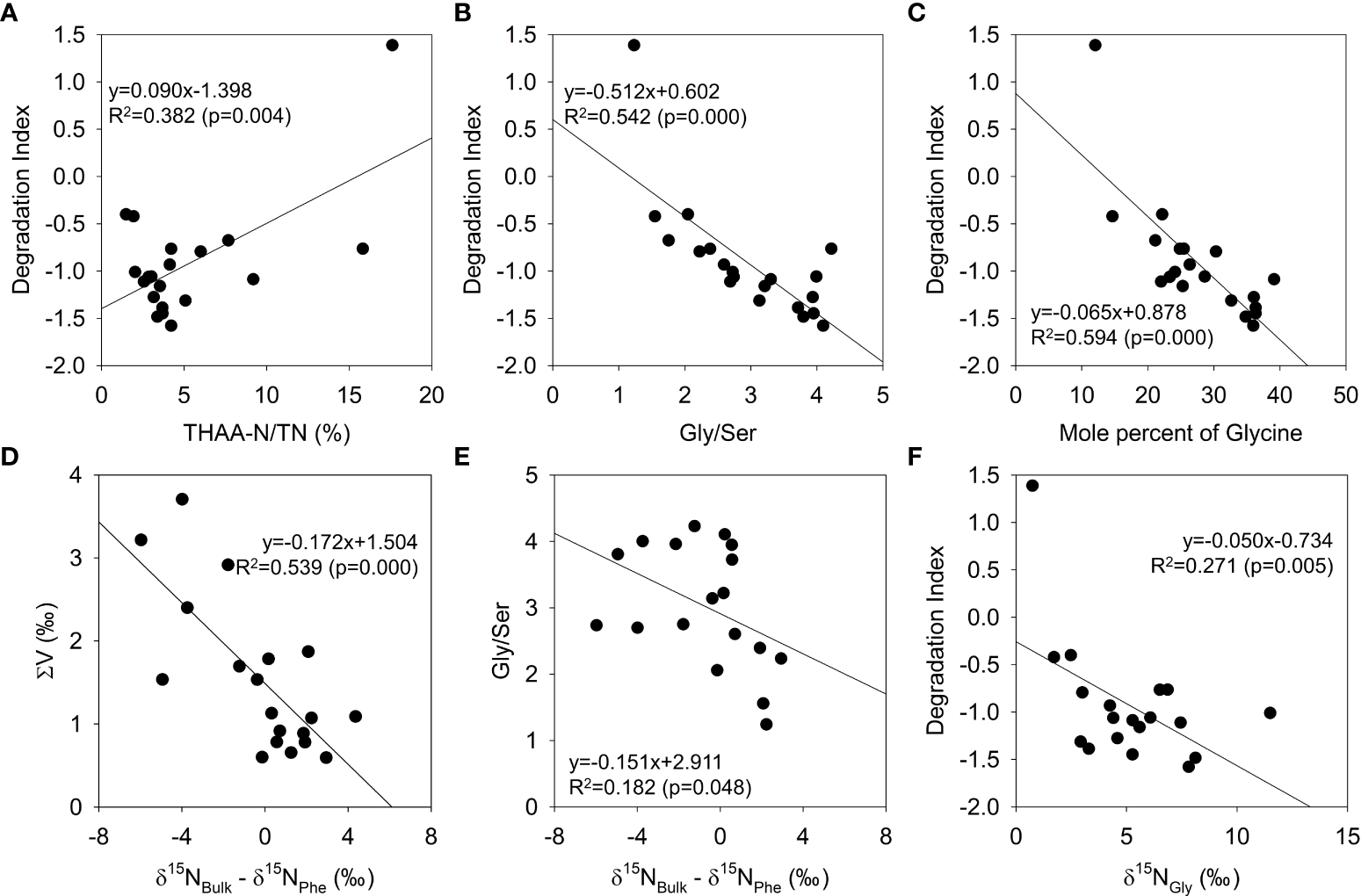 Regressions among diagenetic indicators estimated from core and surface sediment. THAA-N/TN versus DI (A), Gly/Ser versus DI (B), mole percent of Gly versus DI (C), δ15NBulk - δ15NPhe versus ΣV (D), δ15NBulk - δ15NPhe versus Gly/Ser (E), and δ15NGly versus DI (F).