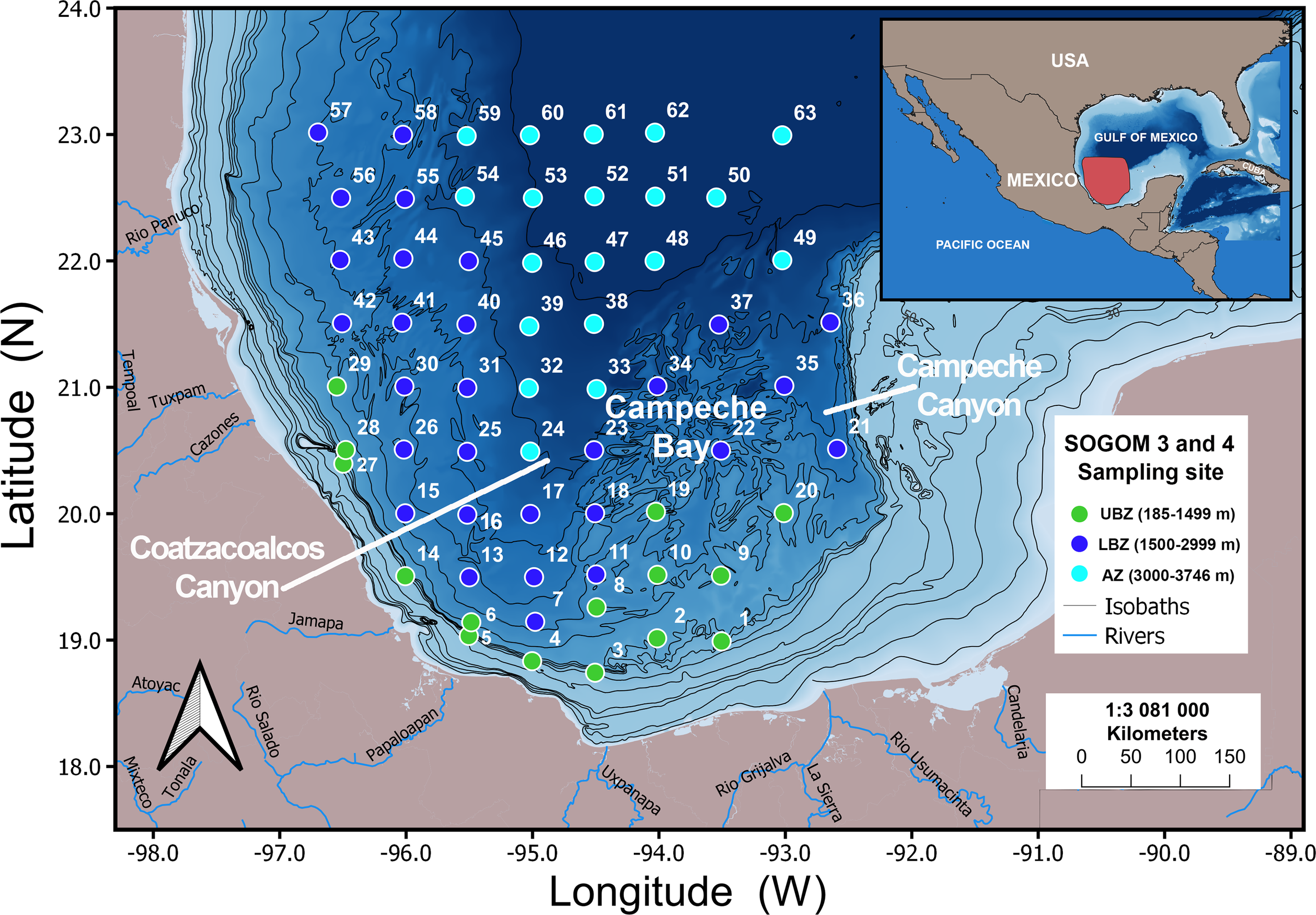 According to Qu et al. (2016), the distribution of benthic communities in the deep sea of the Gulf of Mexico (GoM) are quite well known and it is possible to predict the abundance, species composition, and biodiversity depending on the locality, and depth. Several studies have been carried out in the northern gulf (Rowe et al., 1974; Pequegnat et al., 1990; Baguley et al., 2006a; Baguley et al., 2006b; Baguley et al., 2008; Wei et al., 2010a; Wei et al., 2010b; Sharma et al., 2011; Wei et al., 2012b; Wei et al., 2012a; Carvalho et al., 2013). The macrofauna abundance tends to decrease with increasing depth. This has been reported in other seas (Baldrighi et al., 2014), in the northern Gulf of Mexico (Wei et al., 2012a) and within the study area (Escobar-Briones et al., 1999). On the other hand, diversity frequently exhibits a bathymetric pattern with lowest values in the upper bathyal and abyssal regions and highest ones at intermediate depths (Rex, 1981; Ramirez-Llodra et al., 2010; Wei and Rowe, 2019). Despite of these general patterns, other trends have been reported, frequently in studies based on the analysis of transects (Pérez-Mendoza et al., 2003). These changes usually were associated with horizontal variations of some abiotic factors such as sedimentation rate or organic matter content. However, there are only a few studies on deep-sea macrofauna communities in the Exclusive Economic Zone of Mexico (but see, Escobar-Briones et al., 2008; Escobar-Briones et al., 1999; Salcedo et al., 2017, Hernández-Ávila et al., 2021). So, the diversity and distribution of macrofaunal communities in the deep-sea bottoms of GoM Mexican waters are poorly known compared to the northern GoM. Recently there is a renewed interest to study the GoM and have a comprehensive knowledge of the whole Large Ecosystem and its responses to different stressors. Among them, oil spills like the two mega oil spills occurred in the GoM (Ixtoc 1, 1979-1980 and DHW, 2010). Events of this magnitude could be repeated and are of great concern due to the impacts on deep-water ecosystem (Murawski et al., 2020; Pulster et al., 2020; Reuscher et al., 2020; Schwing et al., 2020). This study was designed to contribute to the knowledge of macrofauna communities through (i) evaluate the taxonomic composition of macrofauna communities at major taxa level, and (ii) analyze the spatial distribution patterns in the deep sea of the southwestern GoM. Data obtained of the large bathymetric and geographic range covered in the southern GoM will contribute substantially to the knowledge of macrofaunal communities in this poor studied area supplying unique information for understanding the GoM as a whole ecosystem. Besides it will provide a baseline data that could be useful to evaluate the impact of man driven activities such as accidental oil spills and/or long-term ecosystem changes.