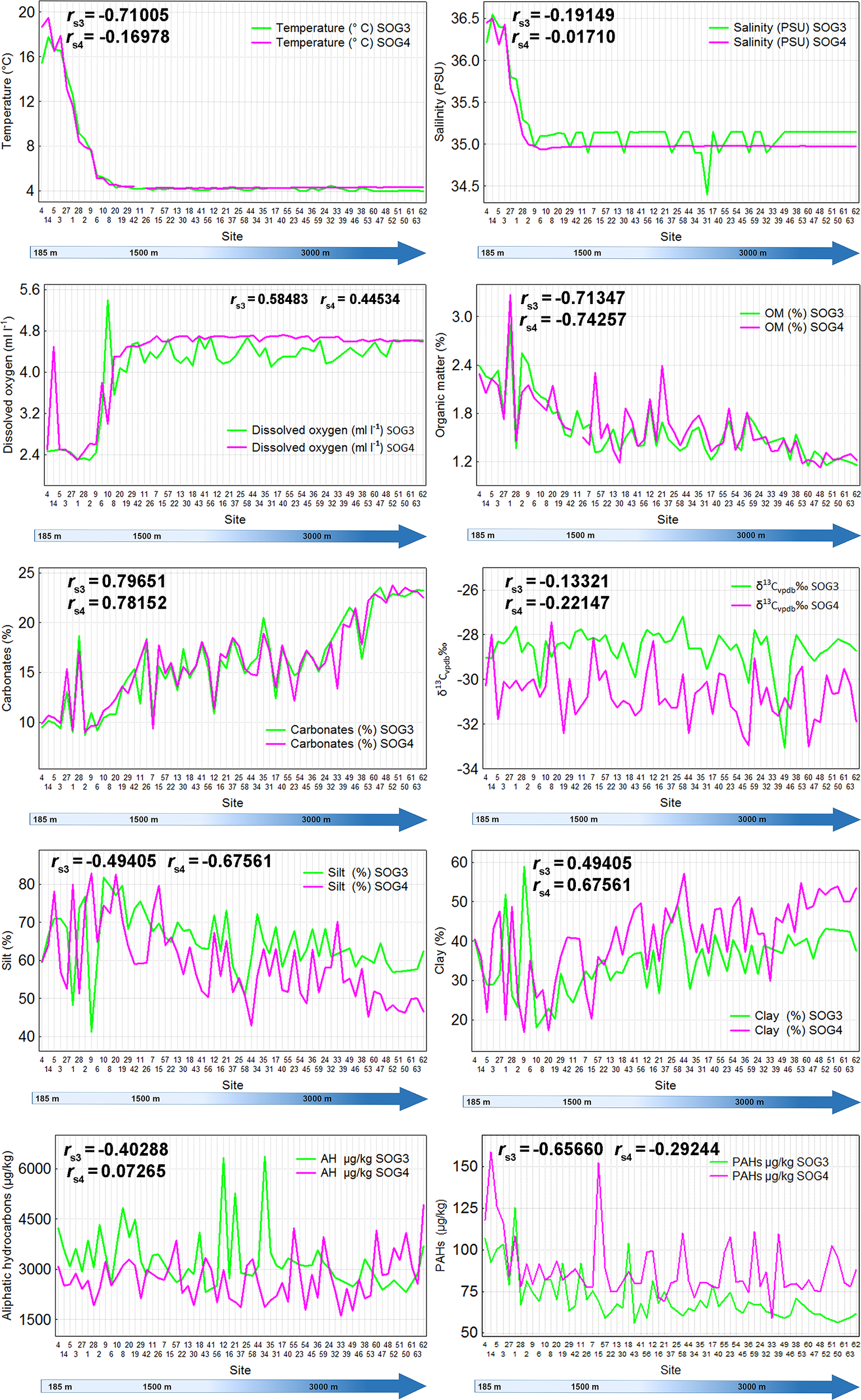 Depth related pattern of environmental factors (sites are ordered from low to highest depth, left to right). SOG3 = SOGOM 3, SOG4 = SOGOM 4, AH = Aliphatic hydrocarbons, PAHs = Polycyclic Aromatic Hydrocarbons, rs3 = Spearman’s correlation coefficient during SOGOM 3, rs4 = Spearman’s correlation coefficient during SOGOM 4.