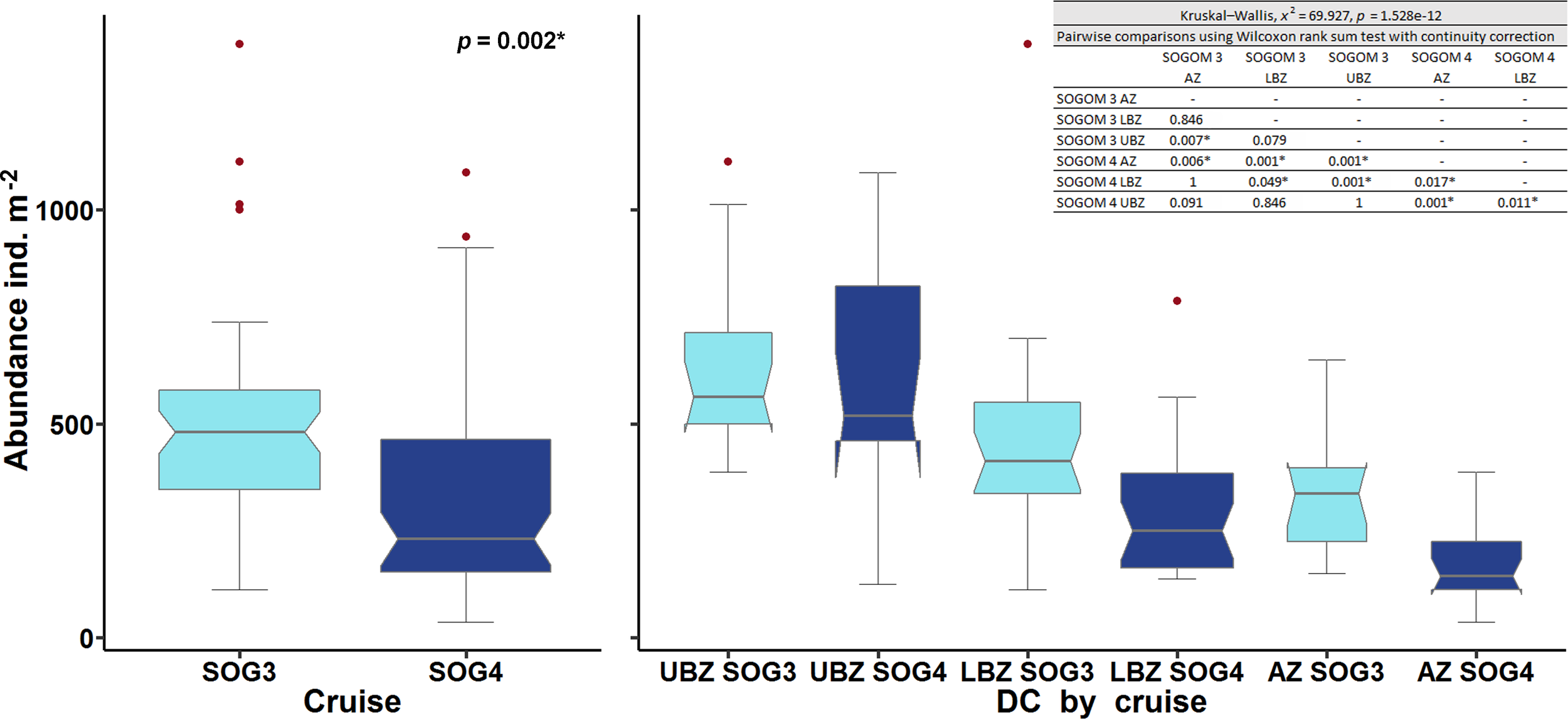 We registered 25 taxa in SOGOM 3 cruise, all of which were also observed in SOGOM 4 cruise with exception of the mollusk class Solenogastres. During the SOGOM 3 cruise we collected 2186 specimens (range: 9 to 111 per site) in 56 sites, while in the SOGOM 4 cruise we obtained 1689 specimens in 62 sites sampled (range: 3 to 87 per site) (Table 1). Locations grouped by DC showed 866, 924 and 396 individuals, and 22, 25, and 14 taxa for UBZ, LBZ, and AZ, respectively in SOGOM 3, and 763, 692 and 234 individuals, and 21, 21, and 15 taxa for UBZ, LBZ, and AZ in SOGOM 4, respectively (Table 2).