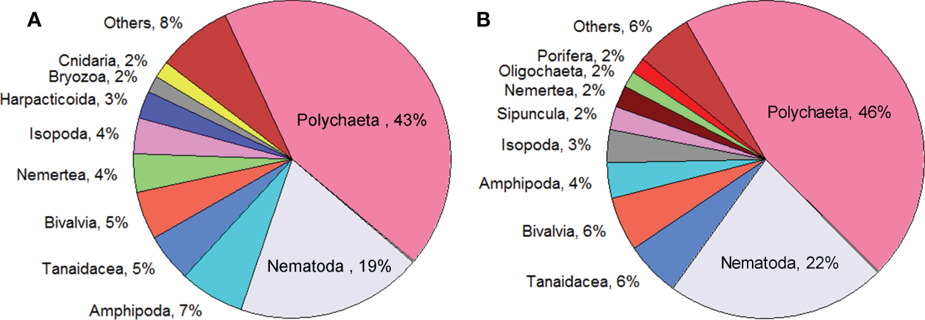 Relative abundance of the ten most abundant macrofauna taxa of SOGOM 3 (A), and SOGOM 4 (B).