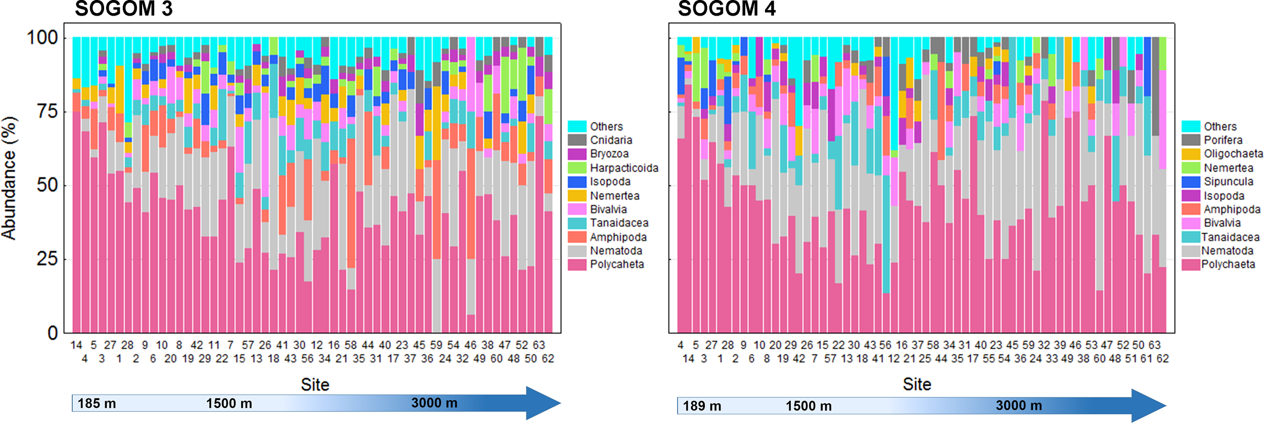 Relative abundance of the ten most abundant macrofauna taxa related to depth in SOGOM 3 and SOGOM 4.