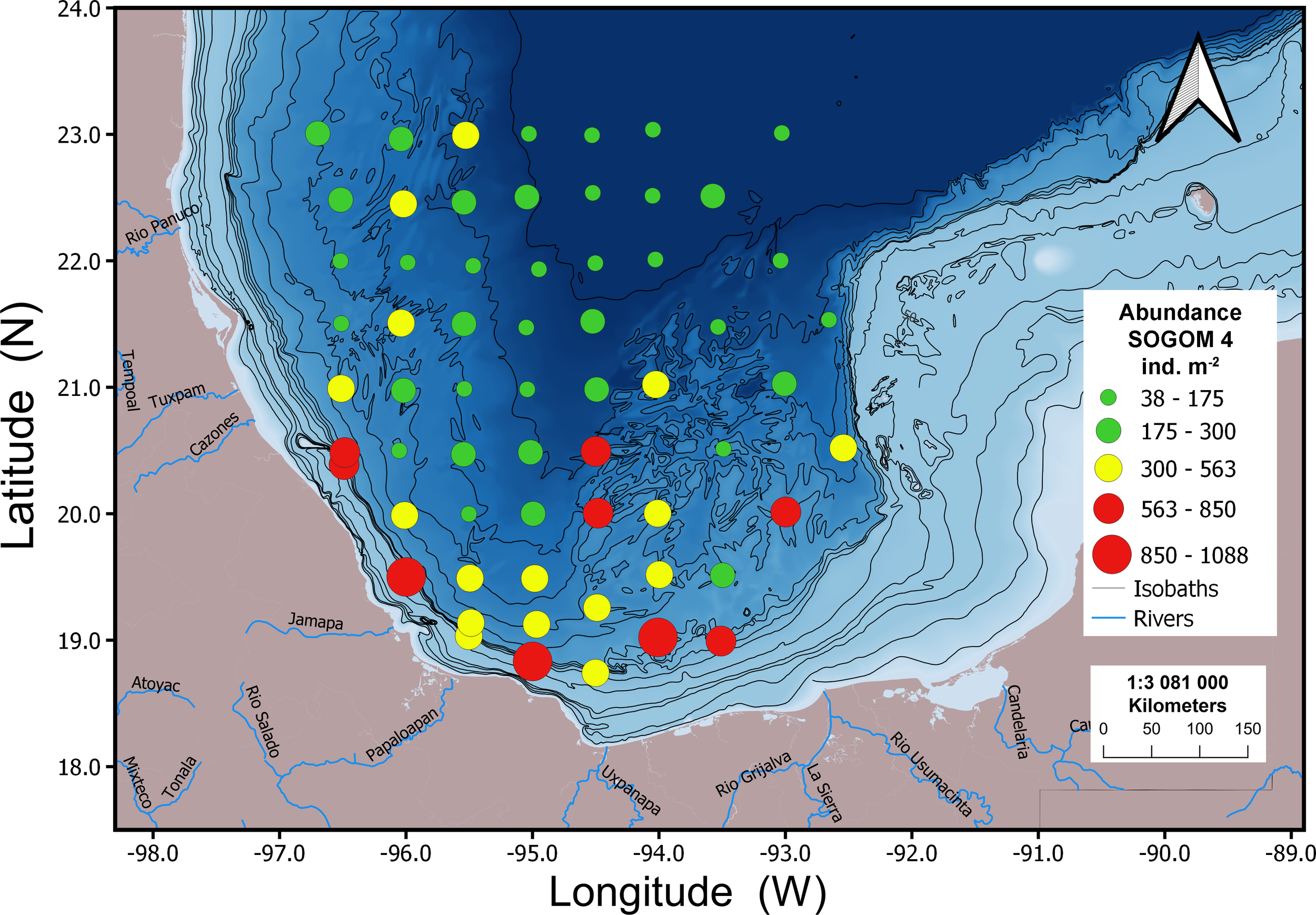 In general, the geographic abundance pattern was similar in both cruises. The highest abundance values were recorded in the south of the study area and locations near to the coastline and the lowest ones were registered in the northern sites. During SOGOM 3 the highest abundance values were recorded at four sites near the coast in the southern region. Intermediate values were associated with locations near the coastline in the southern and northwestern regions, besides sites located in the saline domes zone in the Campeche Bay and the Campeche and Coatzacoalcos Canyon. Low abundance values were recorded in all regions of the study area, particularly in the northern region at the abyssal plain. In SOGOM 4, the highest and intermediate abundance values were again recorded at sites near the coast in the southern region, as well as in most of the localities of the Campeche Bay saline domes zone. Low abundance values were found in the northern zone, except of four sites with intermediate values in the northwestern region (Figures 7, 8).