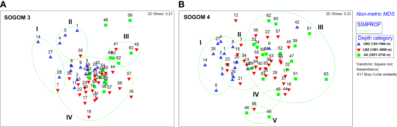 Non-metric multidimensional scaling of macrofauna communities of SOGOM 3 (A) and SOGOM 4 (B) with a classification analysis plotted (green line) based on Bray Curtis similarities. Upper bathyal zone (UBZ-blue triangles), lower bathyal zone (LBZ-red inverted triangles), and abyssal zone (AZ-green square).