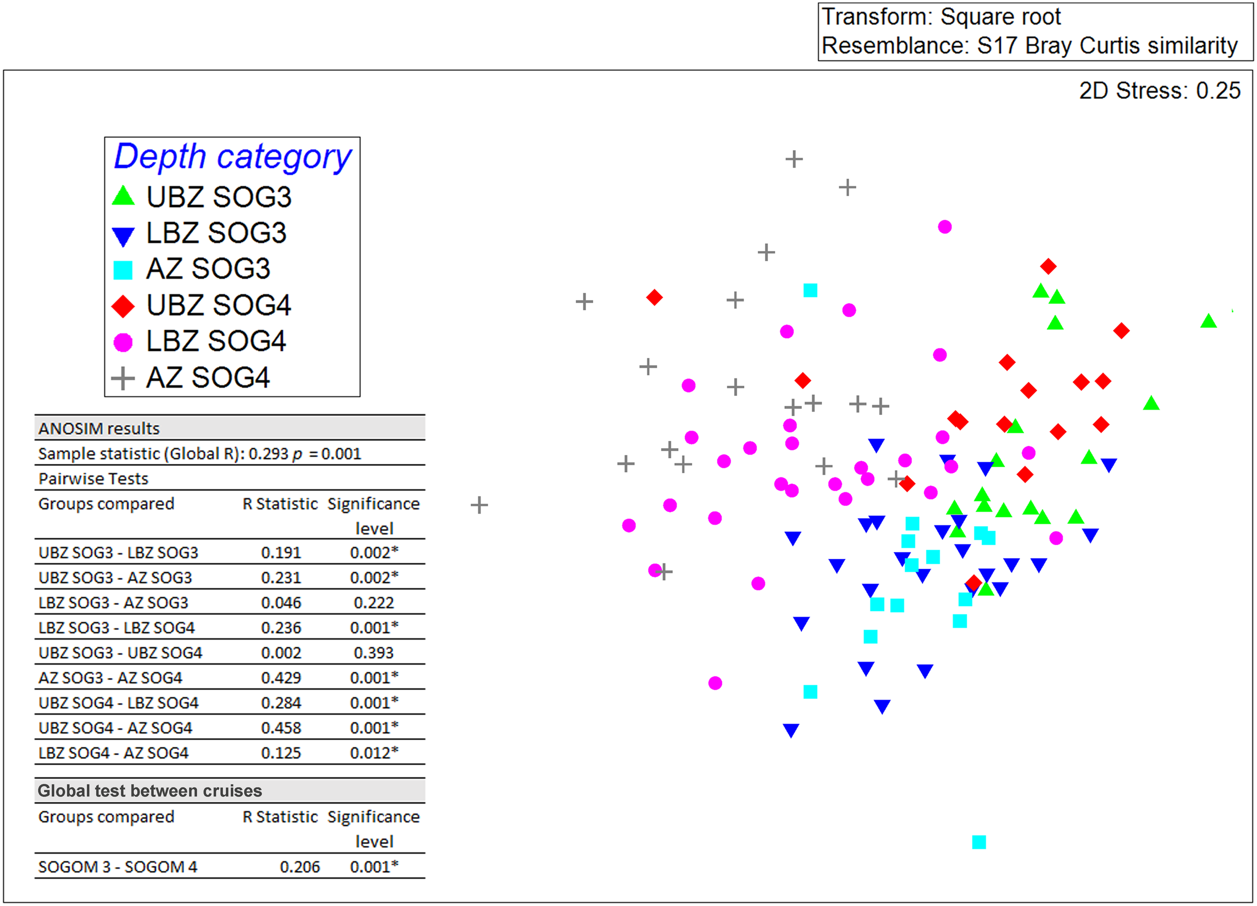 Non-metric multidimensional scaling of SOGOM 3 and SOGOM 4 macrofauna communities based on Bray Curtis similarities. Upper bathyal zone (UBZ), lower bathyal zone (LBZ), abyssal zone (AZ). UBZ in SOGOM 3 (green triangle), LBZ in SOGOM 3 (blue inverted triangle), AZ in SOGOM 3 (light blue square), UBZ in SOGOM 4 (red diamond), LBZ in SOGOM 4 (pink circle), AZ in SOGOM 4 (gray cross).