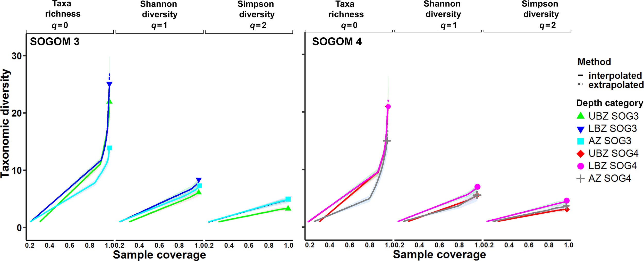 In the analysis of diversity we registered a sample coverage higher than 0.996 for all DCs in both cruises, except AZ in SOGOM 4 that registered 0.988 SC. The sampling curves analysis showed that LBZ registered the highest diversity values in both cruises based on the three Hill numbers analyzed (q = 0, 1, 2), also sharing higher values with AZ during SOGOM 3 with q = 2. However, a close comparison (0.995 sample coverage) showed that there were no significant differences of taxonomic richness among DCs during SOGOM 4 and during SOGOM 3 LBZ was more diverse than AZ and did not present significant differences with UBZ. In the case of the Shannon and Simpson diversity, in both cruises, LBZ was more diverse than UBZ and did not present significant differences with AZ. (Figures 11, 12 and Supplementary data).