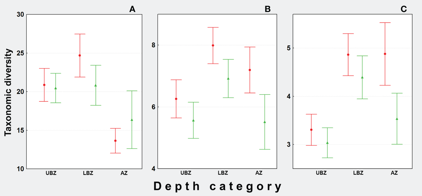 Punctual comparison (0.995 sample coverage) of taxonomic richness (q = 0) (A), Shannon diversity (q = 1) (B) and Simpson diversity (q = 2) (C) during SOGOM 3 (red) and SOGOM 4 (green). Upper bathyal zone (UBZ), lower bathyal zone (LBZ), abyssal zone (AZ).