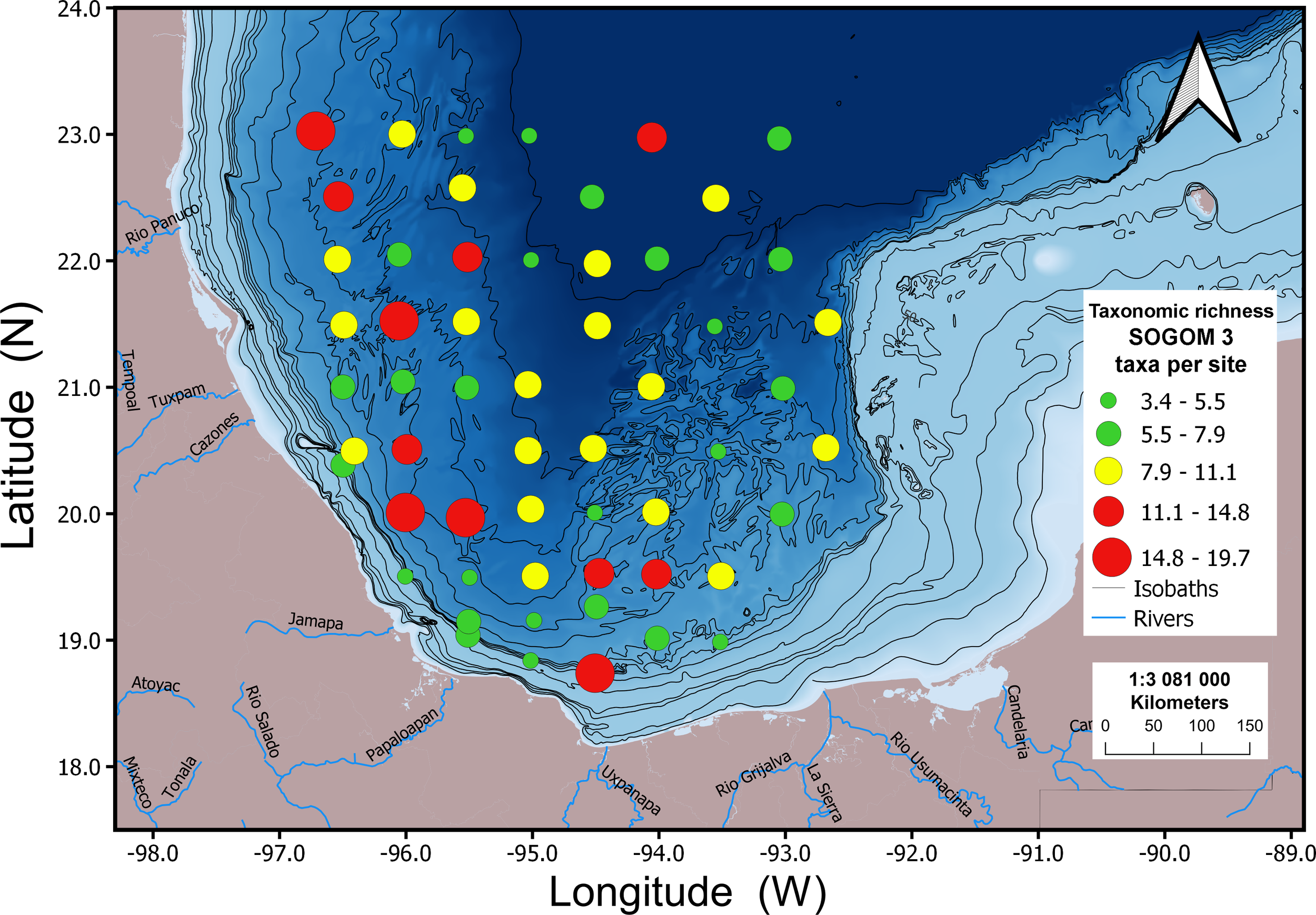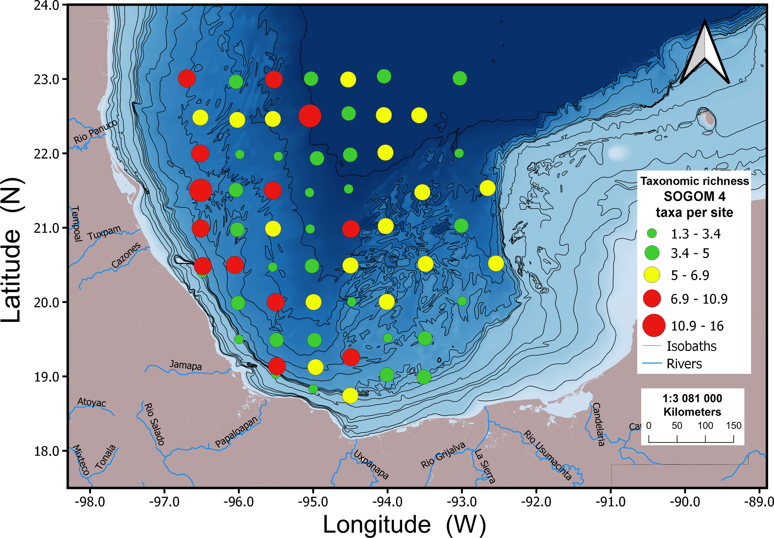 Diversity values (taxonomic richness q = 0) according to geographic distribution in SOGOM 3 showed that low diversity occurred in all regions of the study area. The intermediate values were found in the central region including the Coatzacoalcos Canyon, part of the Campeche Bay saline domes zone, two sites in the Campeche Canyon and five more in the northwestern region. The highest diversity values were associated with localities in the bathyal region in the south and northwest of the study area, besides, one site in the abyssal plain (Figure 13). In SOGOM 4 locations with low diversity records were also spread out along the study area. The highest values were again recorded in the bathyal zone of the northwestern region, two sites in the southwestern region and two more in the abyssal zone. Whereas, in the northern region of the study area, and in the Campeche Bay salt domes zone and in the Campeche Canyon, we registered intermediate diversity values (Figure 14).