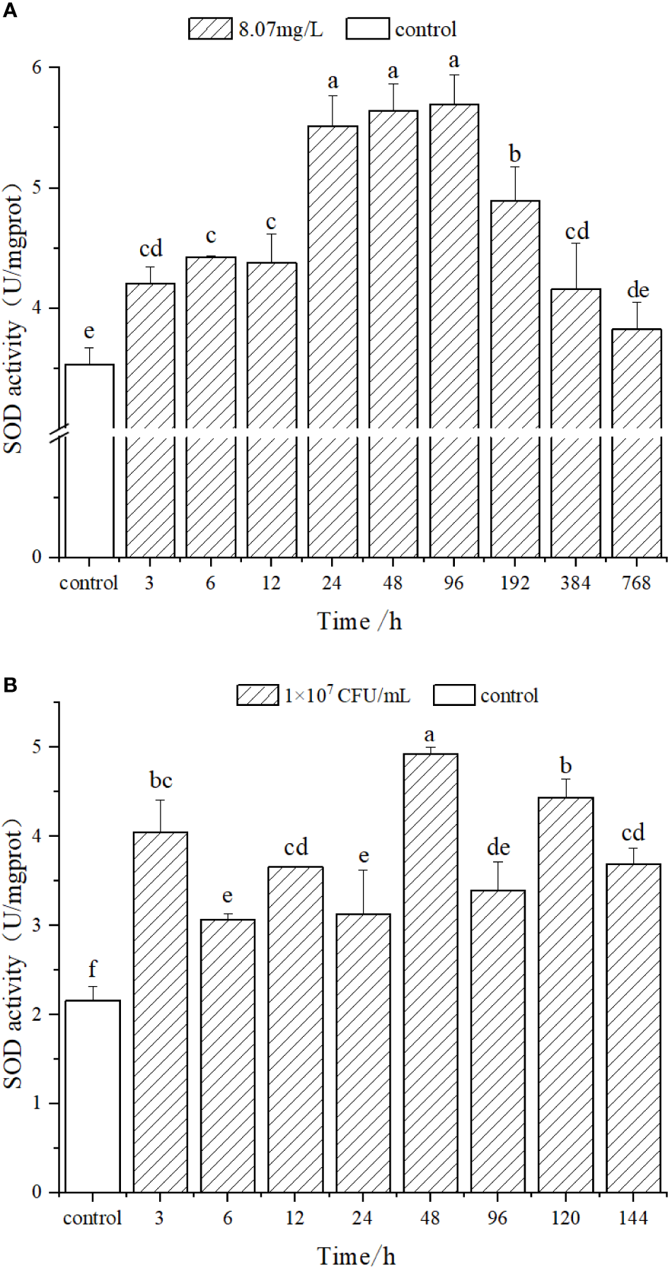 Three individuals in each treatment were randomly selected at different time points during the infection experiment (0, 3, 6, 12, 24, 48, 96, 120, and 144 h). The hepatopancreas was collected and then frozen in liquid nitrogen for the SOD activity analysis and total RNA isolation.