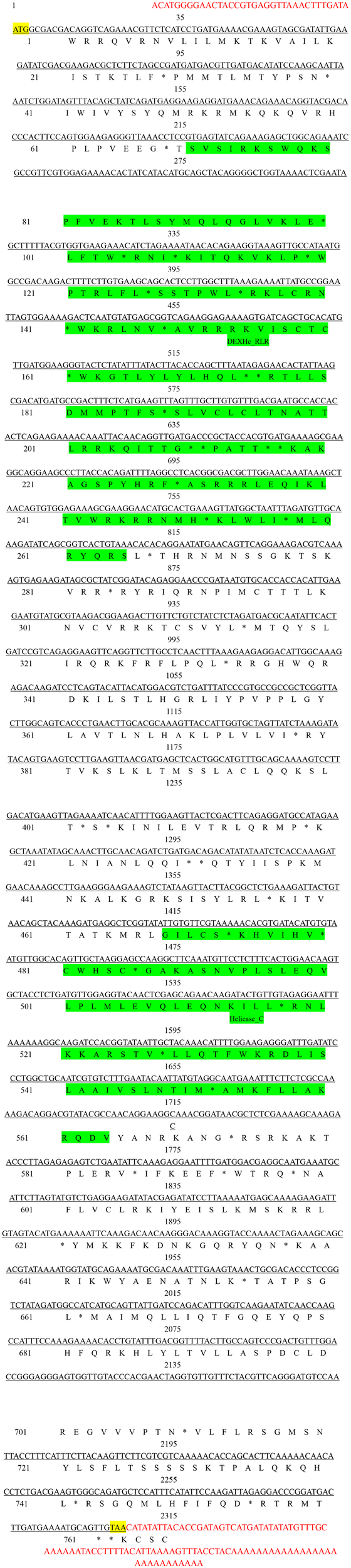 The cDNA of IFITM1 and the deduced amino acid sequence of Cyclina sinensis. The yellow part indicates the start codon ATG and the stop codon TAA, the underlined area indicates the open reading frame (ORF), and the green part indicates the conserved domain of IFITM1.