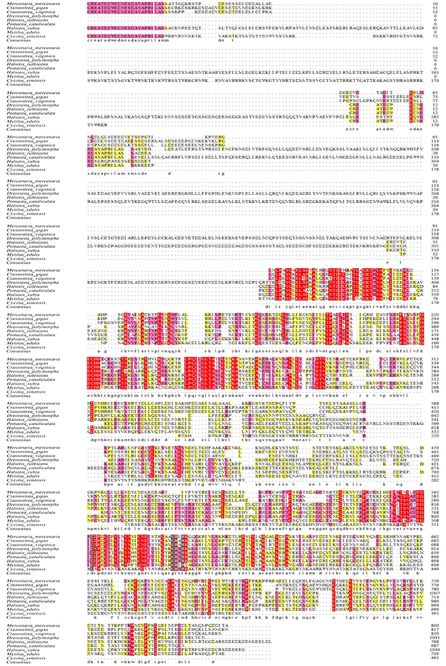 Alignment of the IFITM1 amino acids from Cyclina sinensis and other species. All shaded regions represent residues sharing homology. The light red regions represent homology above 75%, while the dark red regions represent 100% homology. Dots denote amino acid deletion.