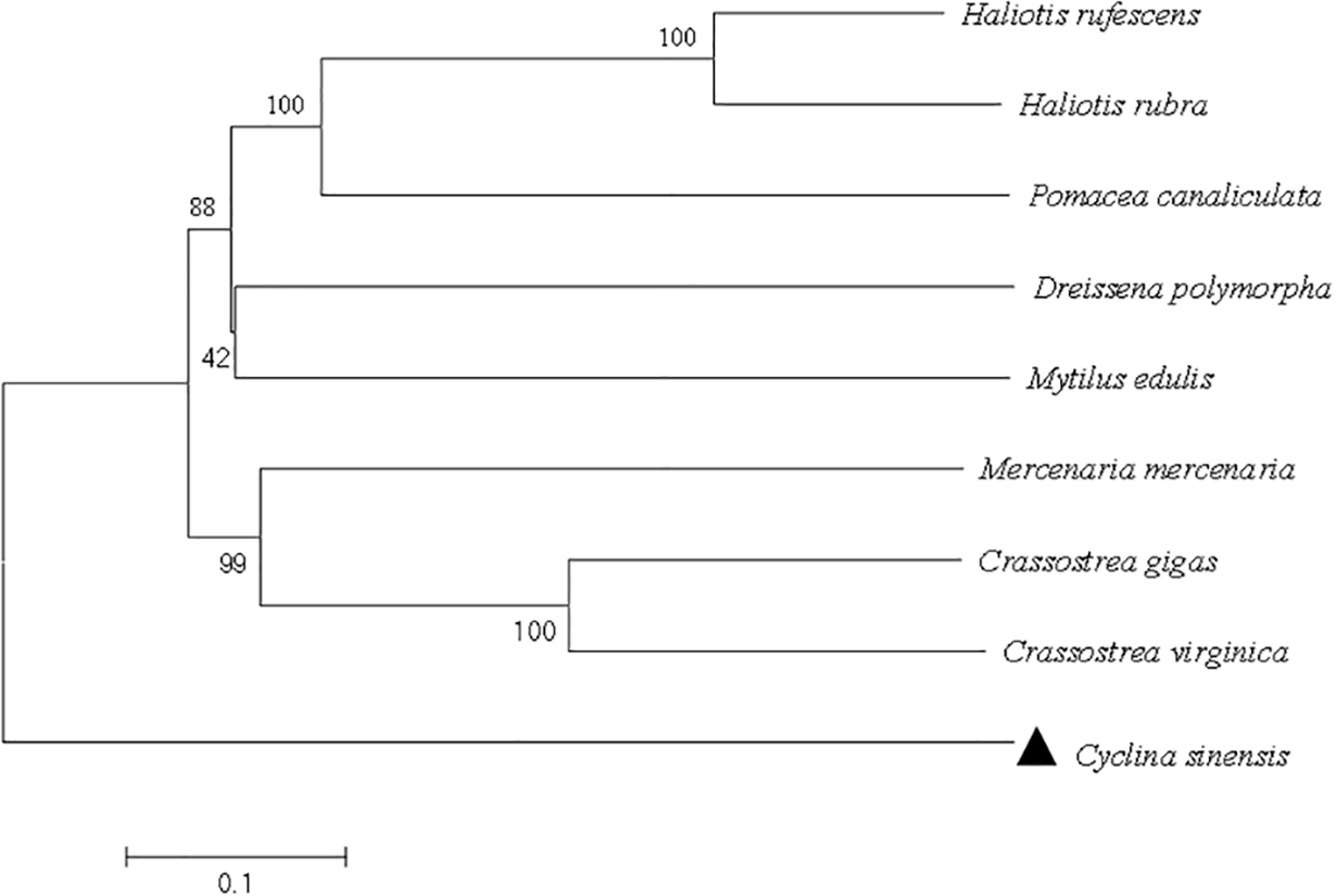 Phylogenetic tree derived from multiple alignment of the IFITM1 amino acids from Cyclina sinensis and other species.