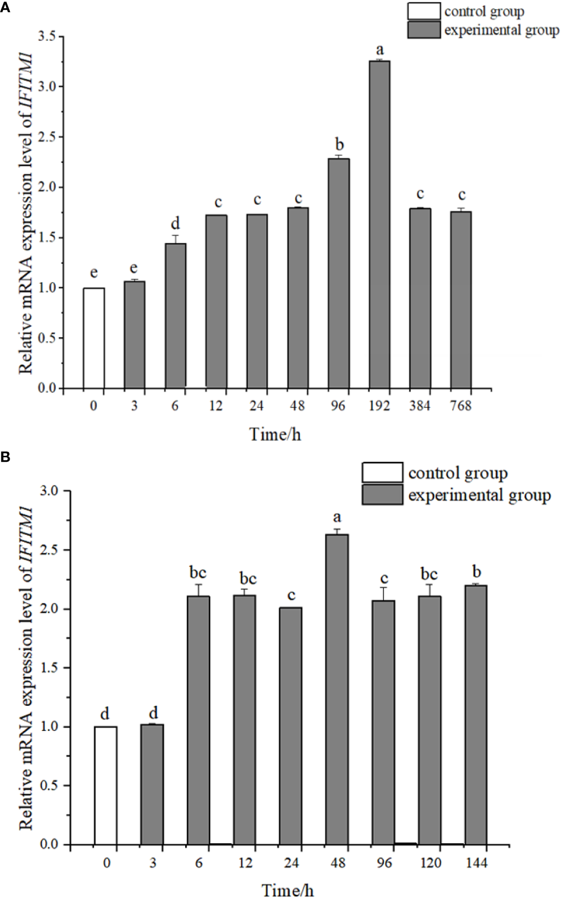 Expression of the IFITM1 gene in the hepatopancreas tissue of Cyclina sinensis. (A) Gene expression in C sinensis exposed to long-term ammonia. (B) Gene expression in C sinensis infected with Vibrio parahaemolyticus. Different letters in the column indicate significant difference (p < 0.05).