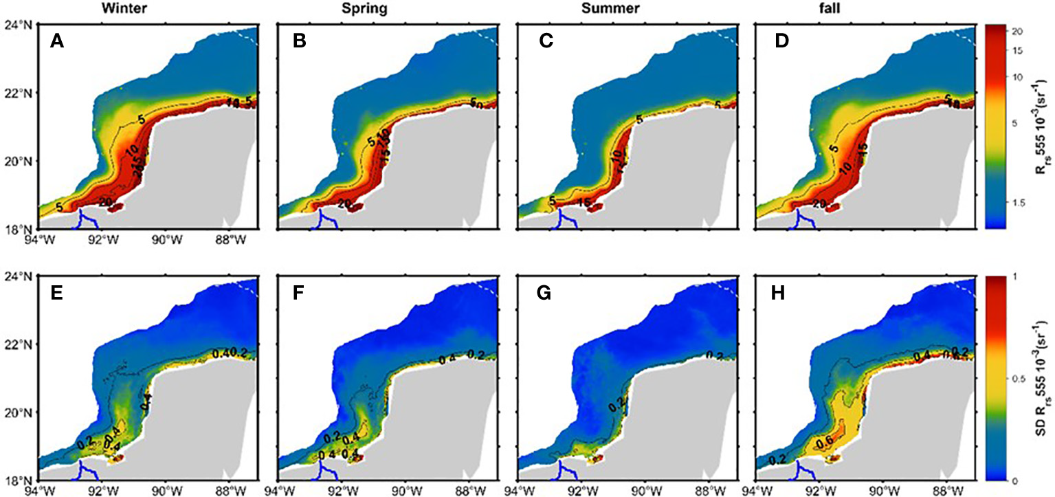 Seasonal climatology of reflectivity [Rrs · 10−3 sr−1 ] on the western side of the Campeche shelf and zonal edge of the Yucatan shelf and their respective standard deviation. (A, E) winter, (B, F) spring, (C, G) summer, and (D, H) autumn. The blue outline corresponds to GURS.