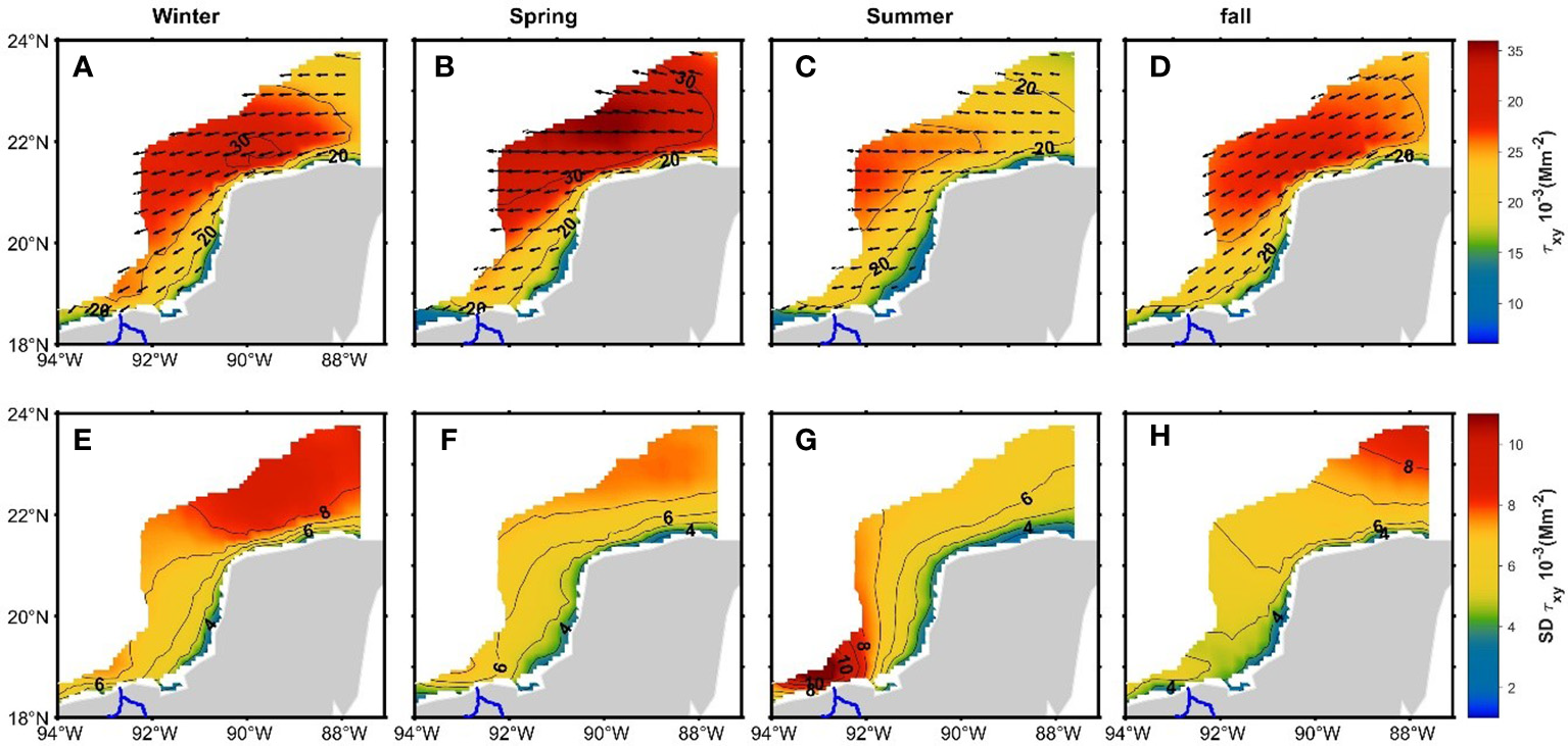 Seasonal climatology of wind stress [τxy · 10−3 Nm−2 ] on the western side of the Campeche shelf and the zonal side of the Yucatán shelf and their respective standard deviation. (A, E) winter, (B, F) spring, (C, G) summer, and (D, H) autumn. The blue outline corresponds to GURS.