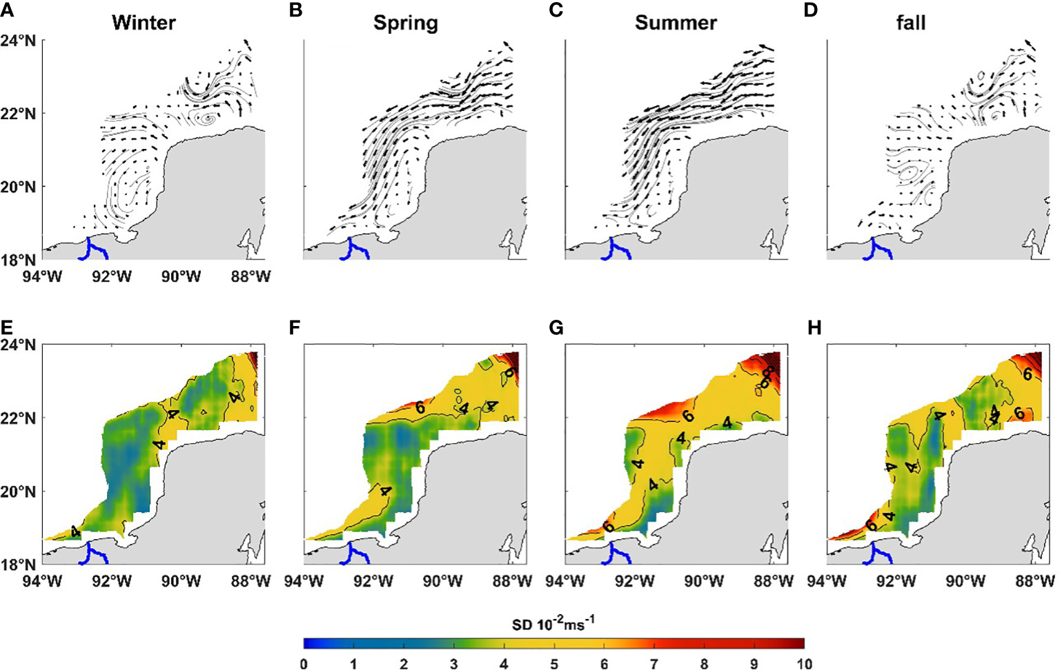 On the other hand, the modeled seasonal current (Figures 9E–H) shows, in the eastern platform, a flow in the form of meanders towards the west that, upon entering the western coast of Campeche bifurcates forming counter-clock gyres that favor the formation of a countercurrent that runs along the curved coast to the northeast in winter (Figure 9E) and that intensifies in autumn (Figure 9H). The circulation on the western side of the Campeche shelf is made up of cyclonic gyres that favor the entry of subsurface water throughout the year, coupled with the countercurrent that couples with the GURS plume.