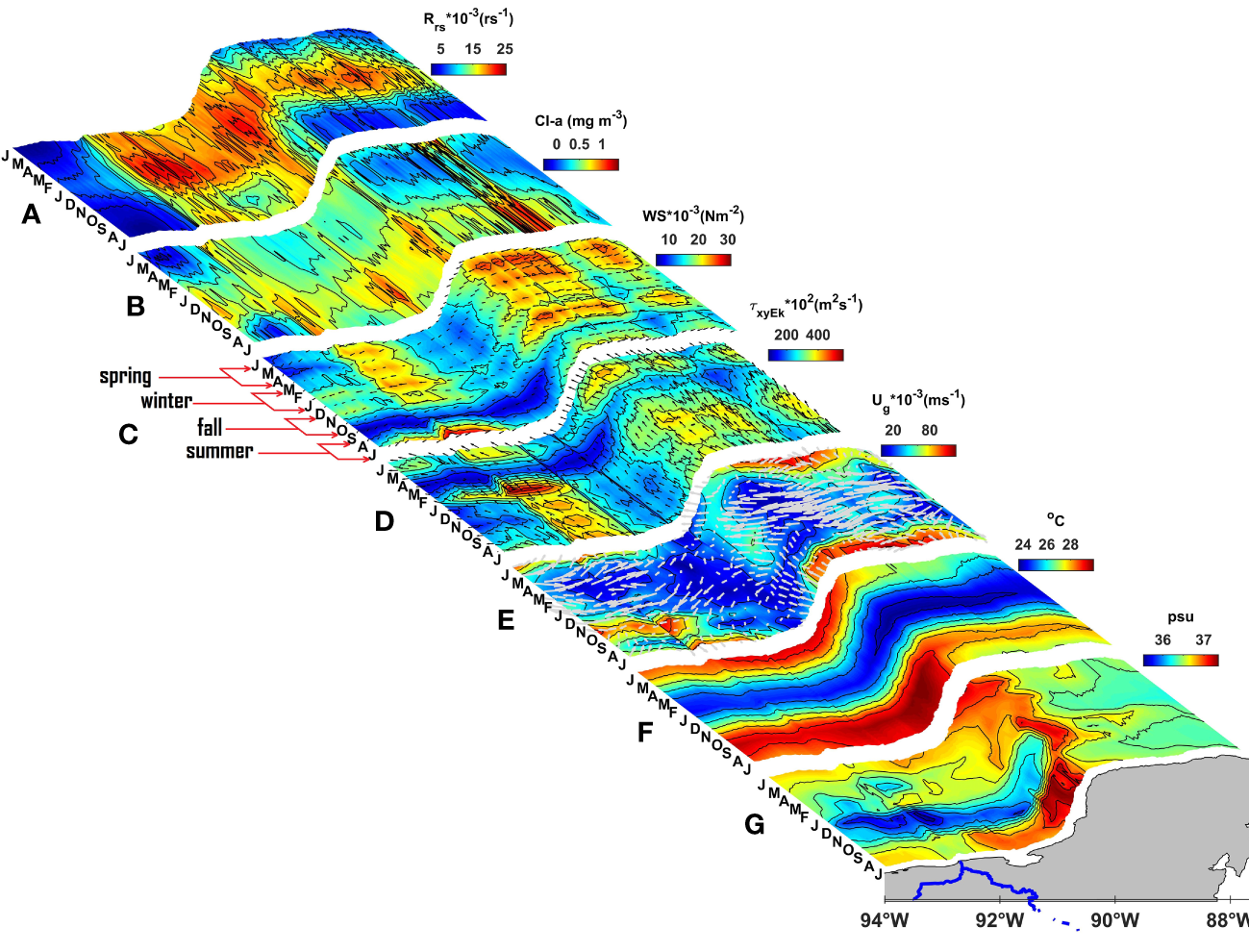On the other hand, the SST (Figure 6F) shows a marked difference between the Yucatan zonal platform and the western side of Campeche. The low temperatures on the zonal side of Yucatán seem to be modulated by the intense winter, spring, and autumn winds (Figures 4A, B, D), except for the summer season when the WS decreases (Figure 4C). Likewise, on the western side of the Campeche platform, the increase in SST stands out from May to October due to the lower ventilation of WS and possible local effects, such as the contribution of warm waters from GURS.