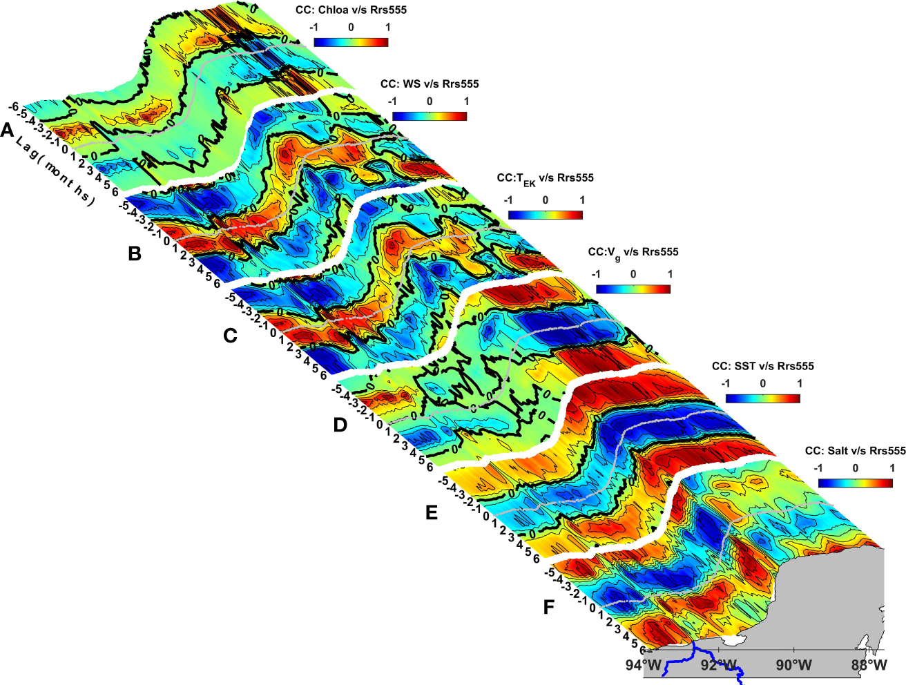 The cross correlation between Chlorophyll and Rrs555 along the coast (Figure 7A) showed that both series are not correlated (correlation coefficient<0.3), except in a small region of the zonal edge of the coast. Yucatan Peninsula around ~89°W.