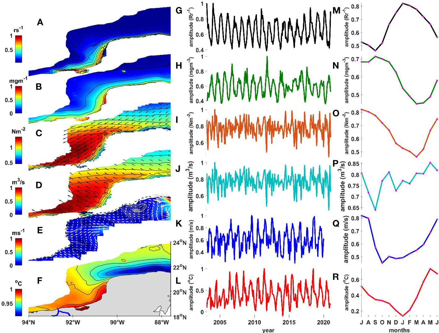 Finally, the EOF of the SST explains 59% (Table 1) of the variance and the spatial structure (Figure 8F) dominated by the seasonal signal (Figure 8l, red line) shows minimum amplitudes compared to the zonal boundary of the Yucatan shelf possibly related to upwelling, however, the maximum SST amplitudes off the western side of Campeche is due to the influence of the GURS flow. Both processes are important in the spring period (Figure 8L, R, red).