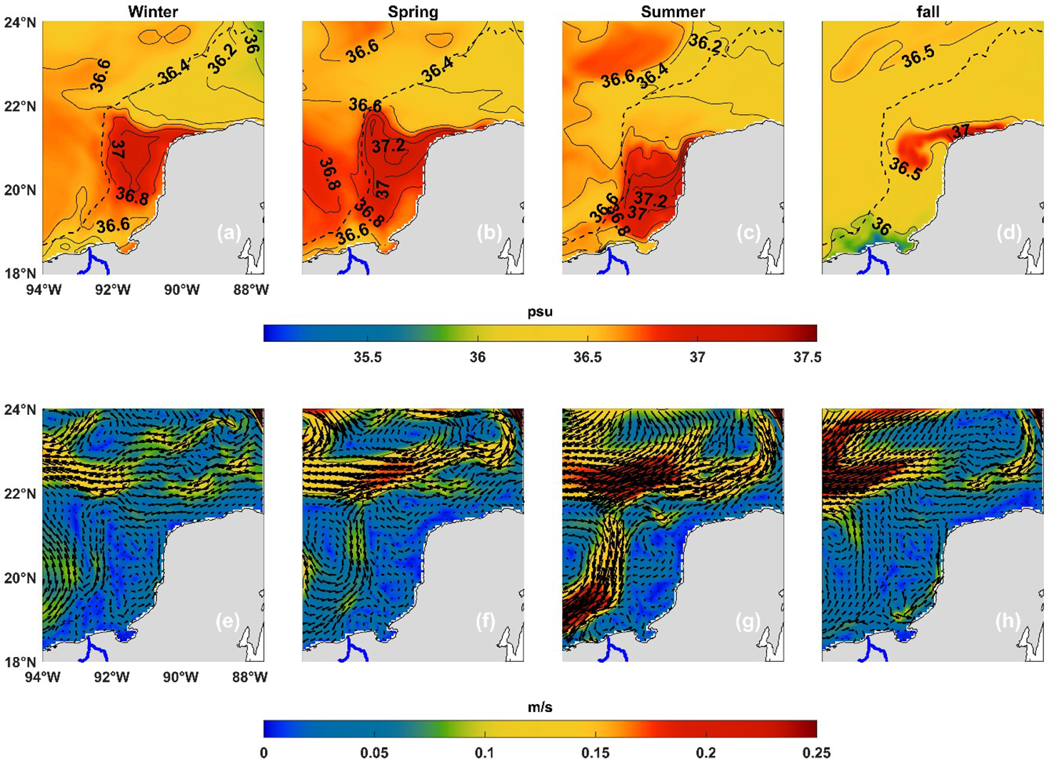 Seasonal surface maps of Salinity (A–D) and Circulation (E–H) in the eastern platform of Yucatan from the CROCO hydrodynamic model.