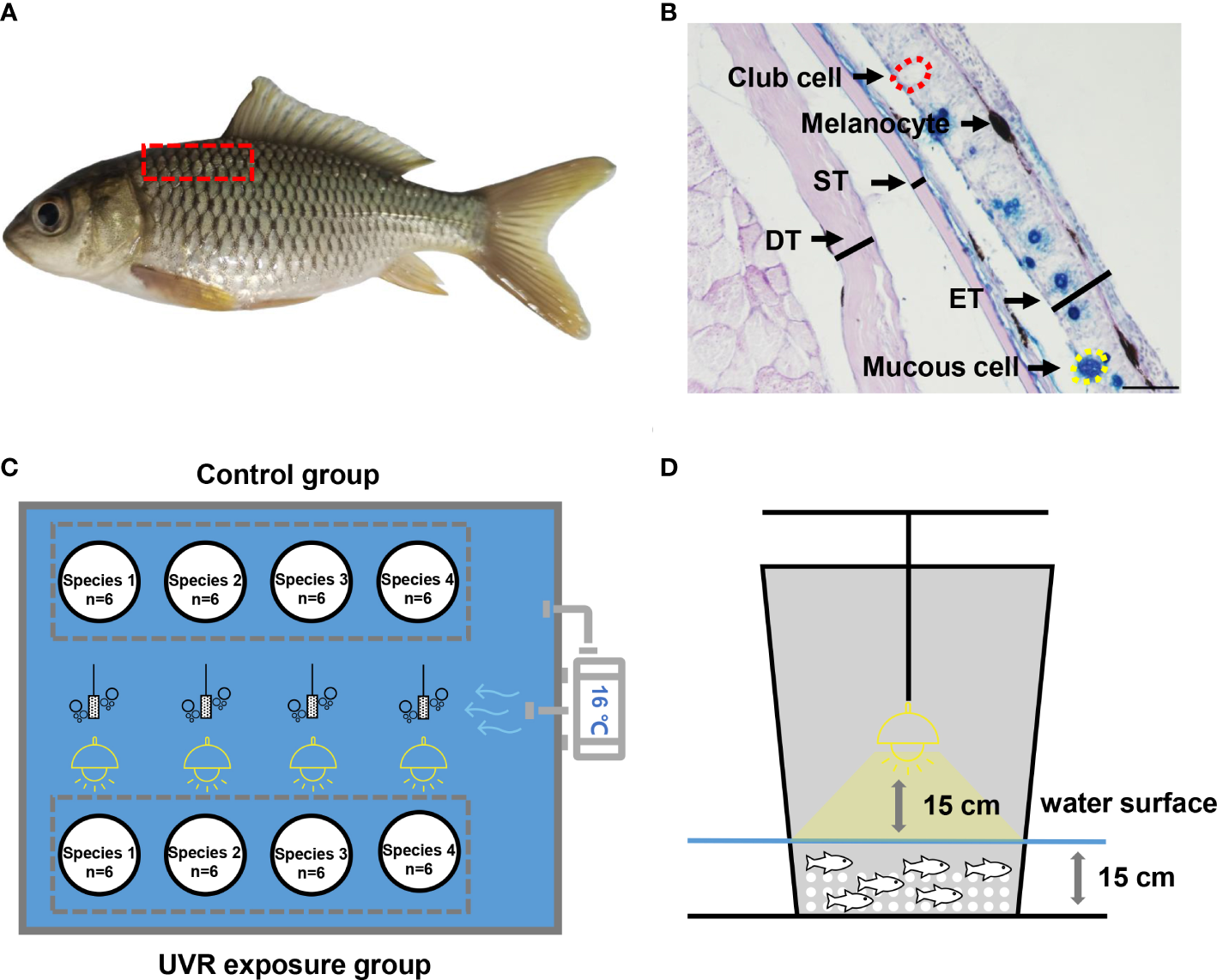 Schematic diagram of experimental methods. (A) Skin tissue sampling area. (B) Histological measurement. ET, epidermal thickness; ST, scale thickness; DT, dermal thickness. The scale is 50 μm. (C) Plane diagram of the UVR exposure experiment. (D) Sectional diagram of UVR exposure experiment.