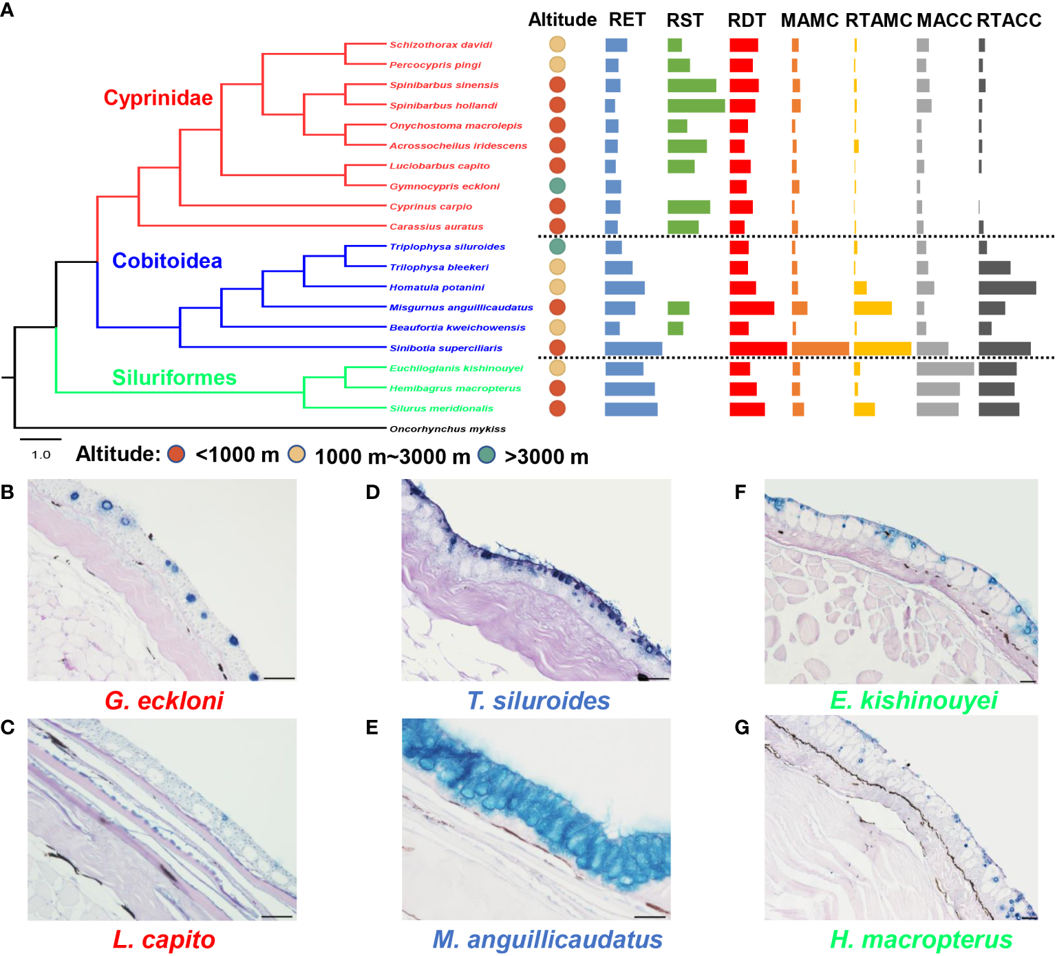 Differences in skin histological structure between high-altitude and low-altitude fishes. (A) The phylogeny, altitude and skin histological indicators (mean, standardized by the maximum) of experimental fishes. (B–G) The skin histological structure of three representative high-altitude fishes and their low-altitude relatives. The scale is 50 μm. RET, the relative epidermal thickness; RST, the relative scale thickness; RDT, the relative dermal thickness; MAMC, the mean area of mucus cells; MACC, the mean area of club cells; RTAMC, the relative total area of mucous cells; RTACC, the relative total area of club cells.