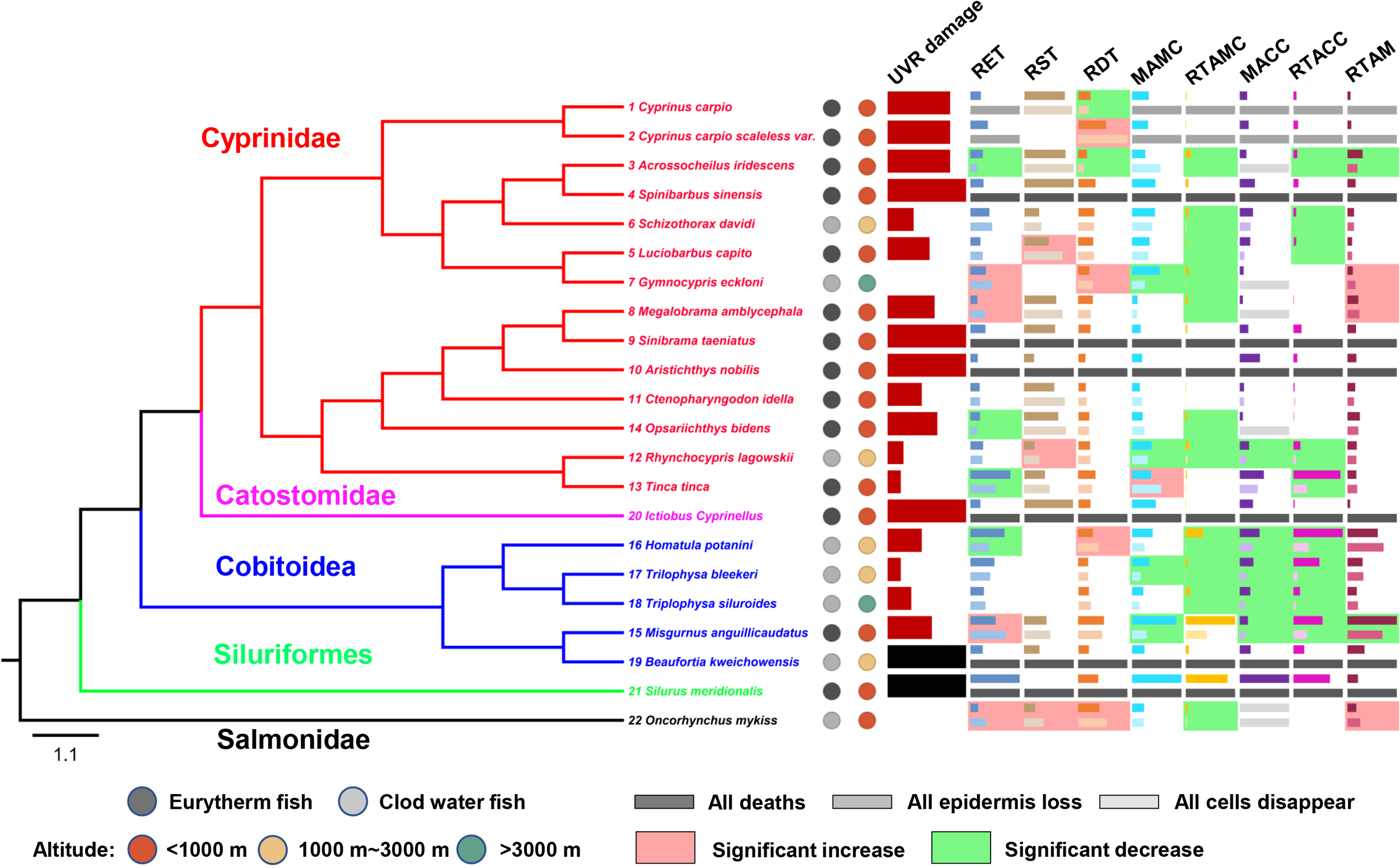 Interspecific differences in UVR damage and skin histological changes of experimental fishes. The black column for UVR damage indicates species that died but had no obvious skin damage and were thus excluded from subsequent analyses. For each skin histological indicator (mean, standardized by the maximum), the dark columns represent the values of the control groups, and the light columns represent the values of the experimental groups. The light red/green background represents a significant increase/decrease (P<0.05) after UVR exposure. The number before the Latin binomial is the serial number of the corresponding species. RET, the relative epidermal thickness; RST, the relative scale thickness; RDT, the relative dermal thickness; MAMC, the mean area of mucus cells; MACC, the mean area of club cells; RTAMC, the relative total area of mucous cells; RTACC, the relative total area of club cells.