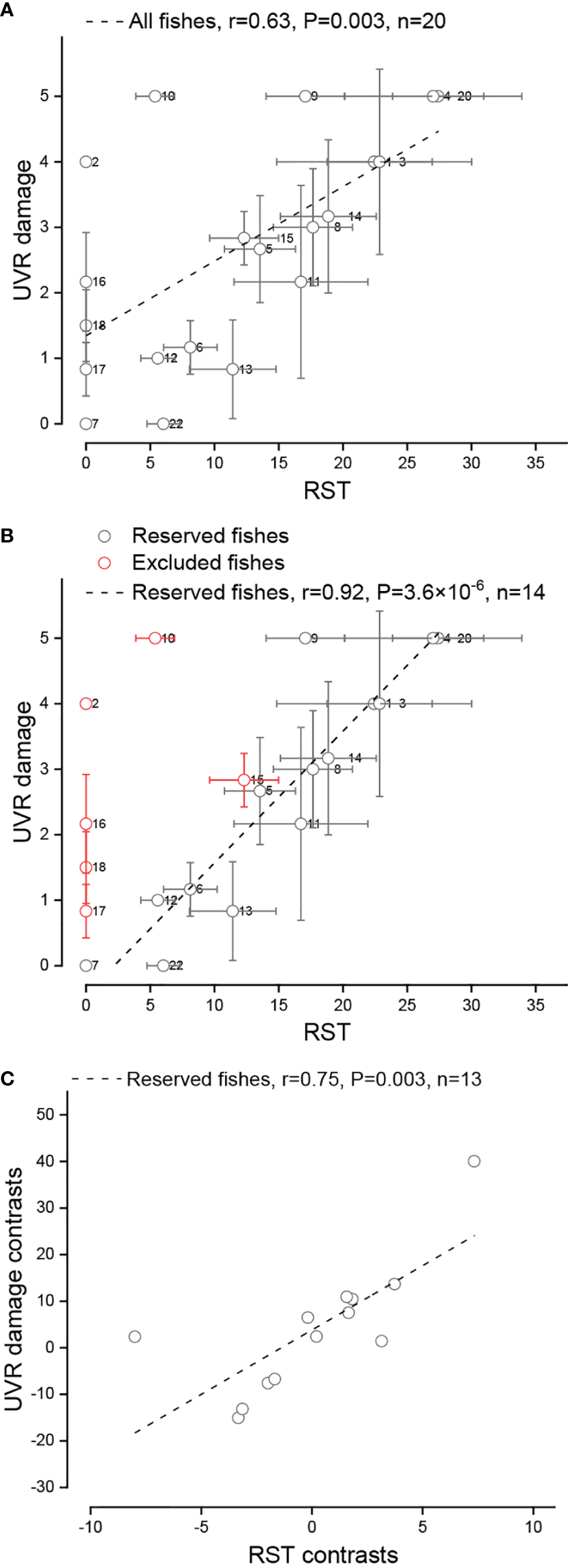 Relationship between the relative scale thickness (RST) and UVR damage of experimental fishes. (A) Traditional correlation between the RST and UVR damage in all fishes. (B) Traditional correlation between the RST and UVR damage in reserved fishes. (C) Correlation between the RST and UVR damage in reserved fishes as measured by PIC analysis. The circle and whiskers indicate the mean ± SD. A data point will be lost in PIC analysis.