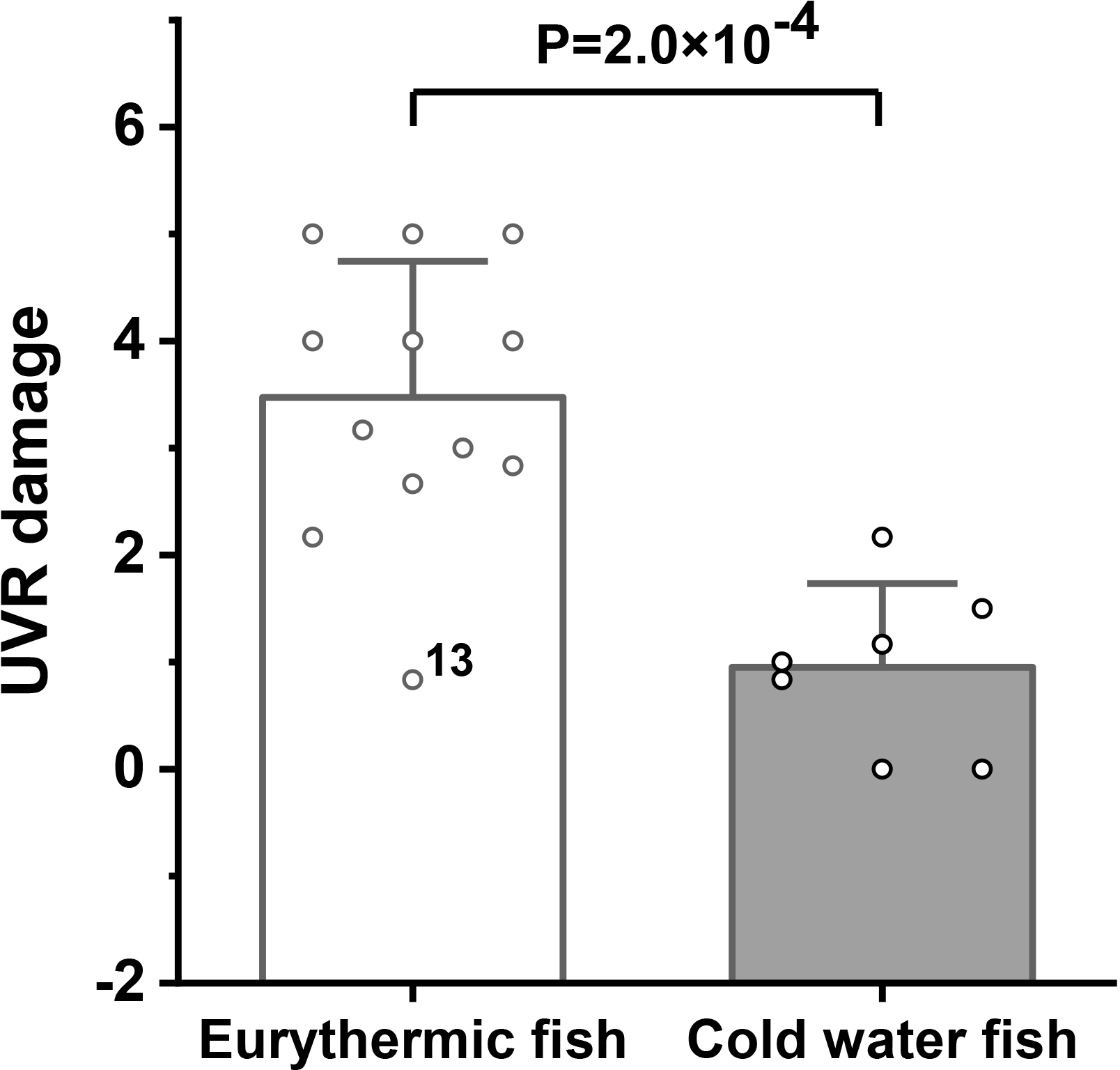 Comparison of UVR damage between eurythermal and cold water fishes. The height and whiskers indicate the mean ± SD.
