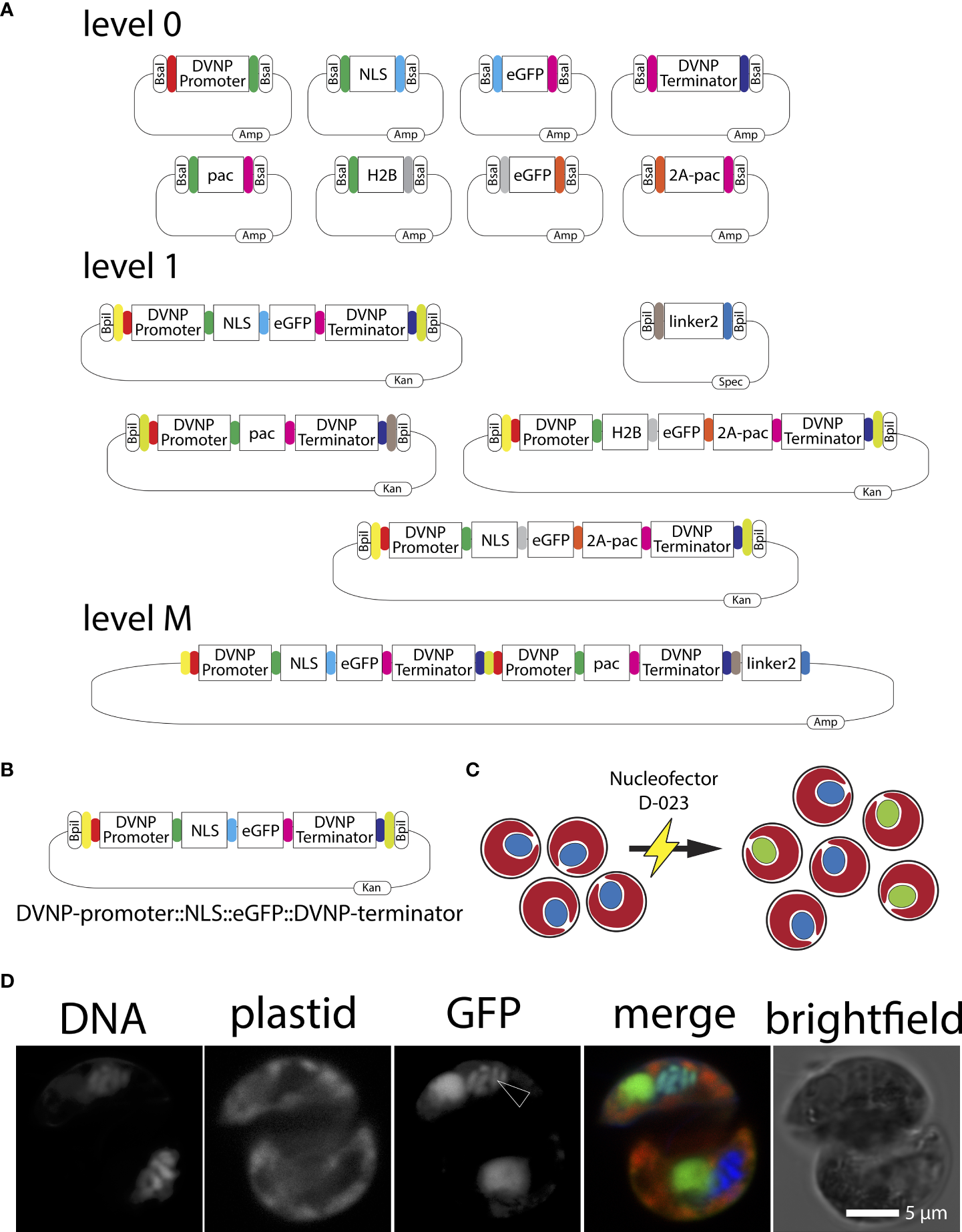 (A) Graphical representation of level 0, level 1, end-linker, and level M Golden Gate modules used in this study. Kan=kanamycin, Amp=ampicillin, Spec=spectinomycin. (B) Graphical representation of the DVNP-promoter::NLS::eGFP::DVNP-terminator level 1 position 1 module. (C) Cartoon depicting the Nucleofector electroporation of Breviolum SSB01 cells (red plastid auto-fluorescence with blue nuclei) and resulting localization of the nuclear targeted NLS-eGFP (red plastid auto-fluorescence-containing cells with green nuclei) following transformation. (D) Confocal image of a transformed SSB01 cell showing expression and translocation of GFP to the nucleus. Note: all SSB01 cells contain a structure that resembles an accumulation body as described by Wakefield et al. (2000). This accumulation body very often sits near the nucleus and exhibits strong autofluorescence at 501-550 nm when excited with a 488-nm laser line.