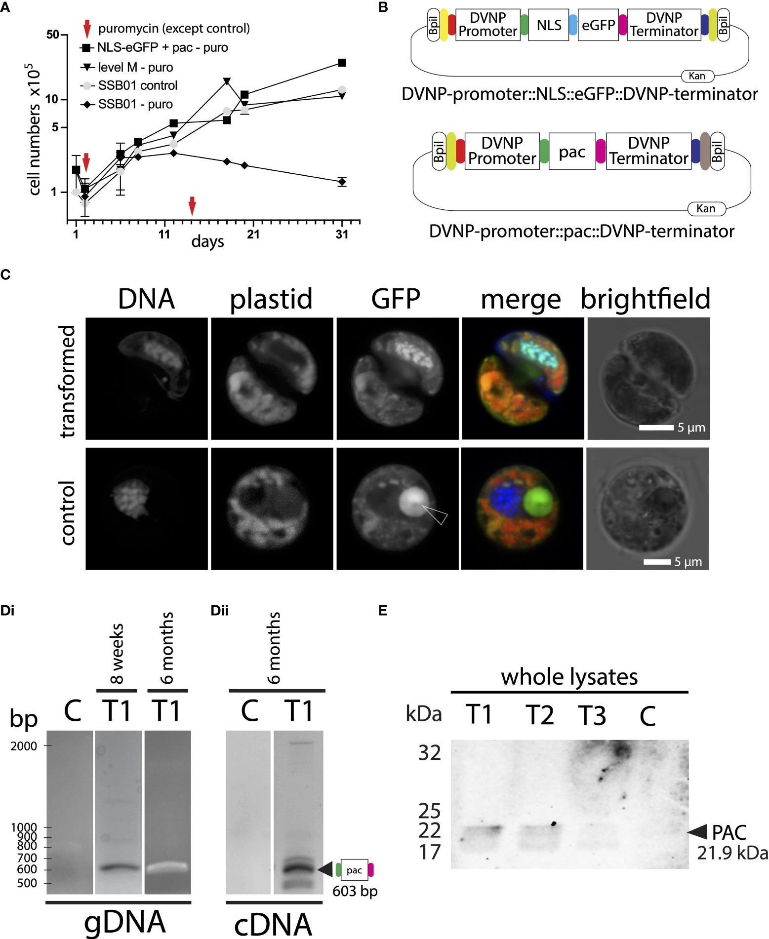 (A) Addition of puromycin 100 µg ml-1 at day 1 and day 14 shows clear growth inhibition in untransformed SSB01 cells (SSB01-puro). Transfected cells (NLS-eGFP+pac-puro and level M-puro) and cells without addition of puromycin (SSB01-control) grow steadily and at a similar rate. (B) Graphical representation of the DVNP-promoter::NLS-eGFP::DVNP-terminator level 1 position 1 and DVNP-promoter::pac::DVNP-terminator level 1 position 2 modules. (C) Confocal image of transformed and untransformed SSB01 cells clearly showing expression and translocation of GFP to the nucleus in the presence of the expression vector. Note: all SSB01 cells contain a structure that resembles an accumulation body as described by Wakefield et al. (2000). This accumulation body very often sits near the nucleus and exhibits strong autofluorescence at 501-550 nm when excited with a 488-nm laser line. (Di) PCR and RT-PCR for pac in gDNA and cDNA from double transformed NLS-eGFP/PAC transformant T1 indicating apparent good expression of pac at 8 weeks post-transformation. (Dii) RT-PCR for pac in cDNA from double transformed NLS-eGFP/PAC transformant T1 indicating that good expression of pac persists for at least 6 months post-transformation. (E) Anti-PAC Western blot showing that cells from transformants T1-T3 express PAC at 8 weeks post transformation, but with variable intensities.