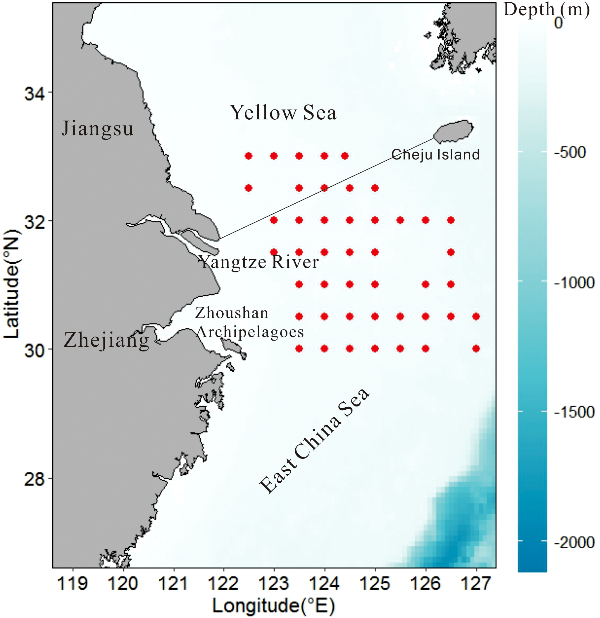 Sample locations for demersal trawl surveys for fish stocks in the northern East China Sea. Color bar indicates water depth.