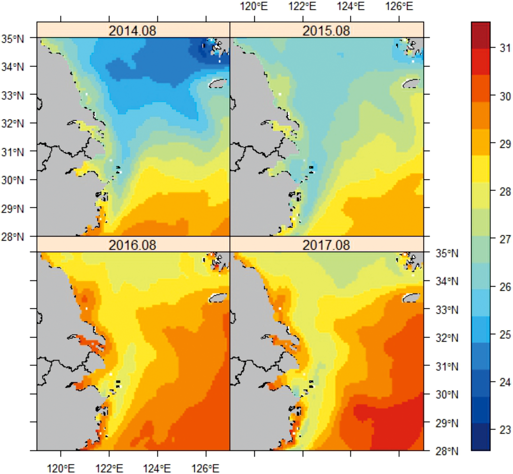 The East China Sea experienced a significant warming event in the summer and autumn of 2016–2017. During this anomaly period, SST reached more than 2.5°C higher than the climatological values. The mean monthly SST was 29.2°C in the August of 2016–2017. Compared with the preceding 2 years, SST increased by 2.3°C (Figure 2). The warming event was driven by the strengthening of the Taiwan warm current and the transfer of warm tropical water northwestwards.