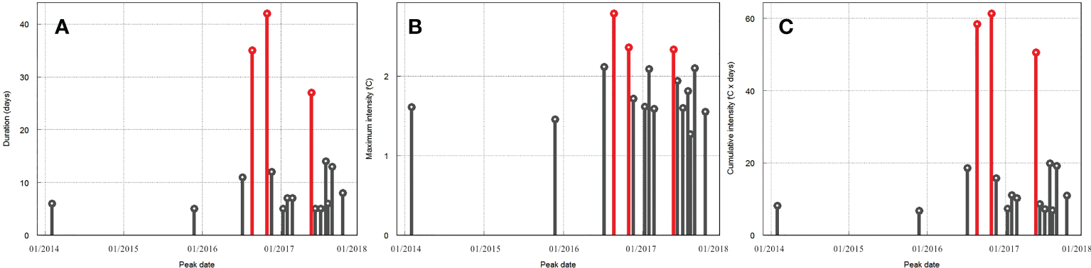 Mean MHW (A) duration, (B) maximum intensity, and (C) cumulative intensity in the study area from 2014 to 2017. The top three events were highlighted in red colour.