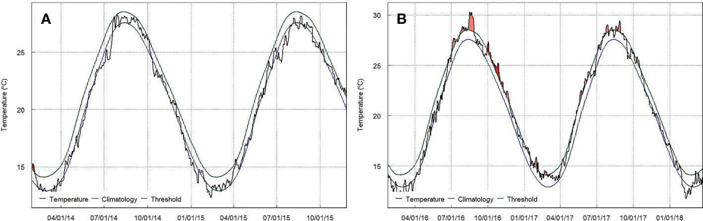 Event line for detected marine heatwaves at the study area during (A) 2014–2015 and (B) 2016–2017 (red filled area is the marine heatwaves evens of interest in this study). The blue line, green line, and black line represent SST climatology, 90th percentile MHW threshold, and SST time series.